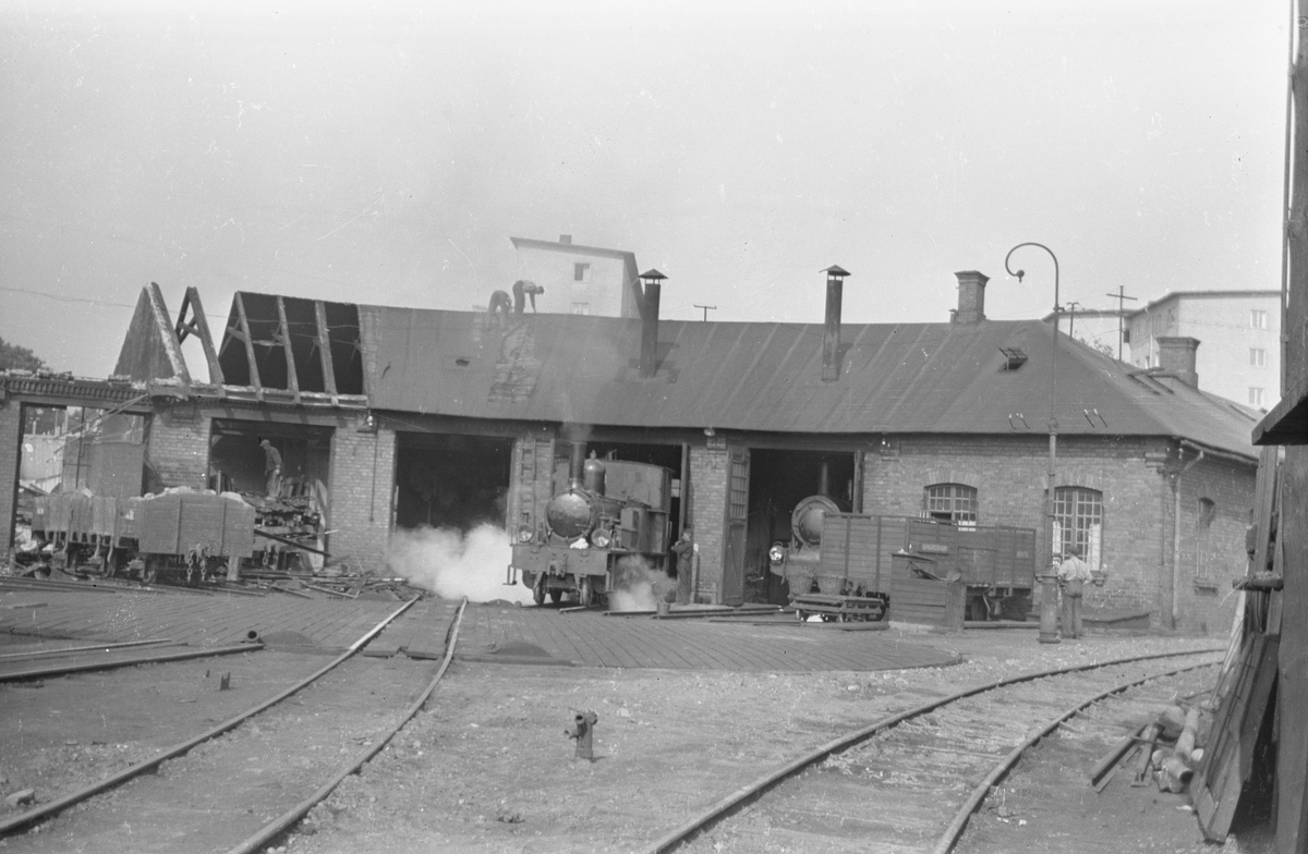 SRJ lokstall i Stockholm efter påbörjad rivning. Stockholm - Rimbo Järnväg.