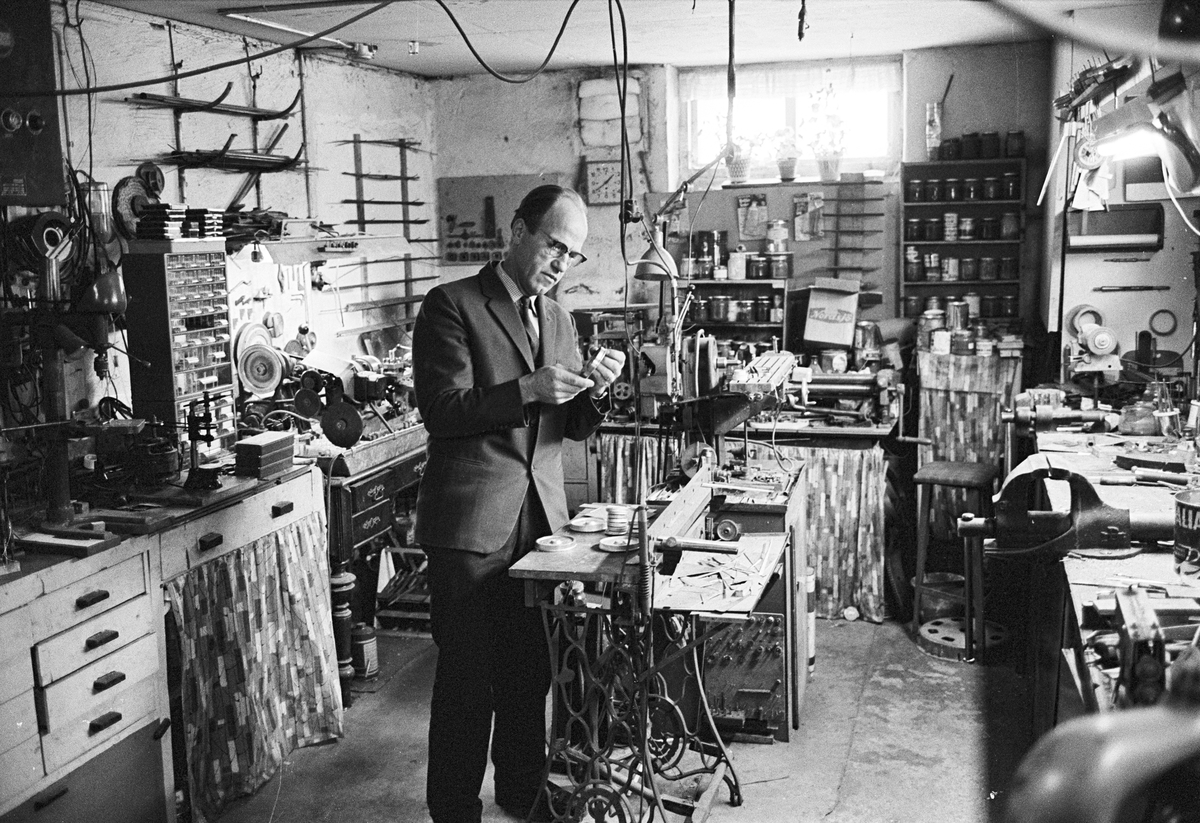 Titel: Valter Larsson i sin modellbyggarverkstad i Mackmyra