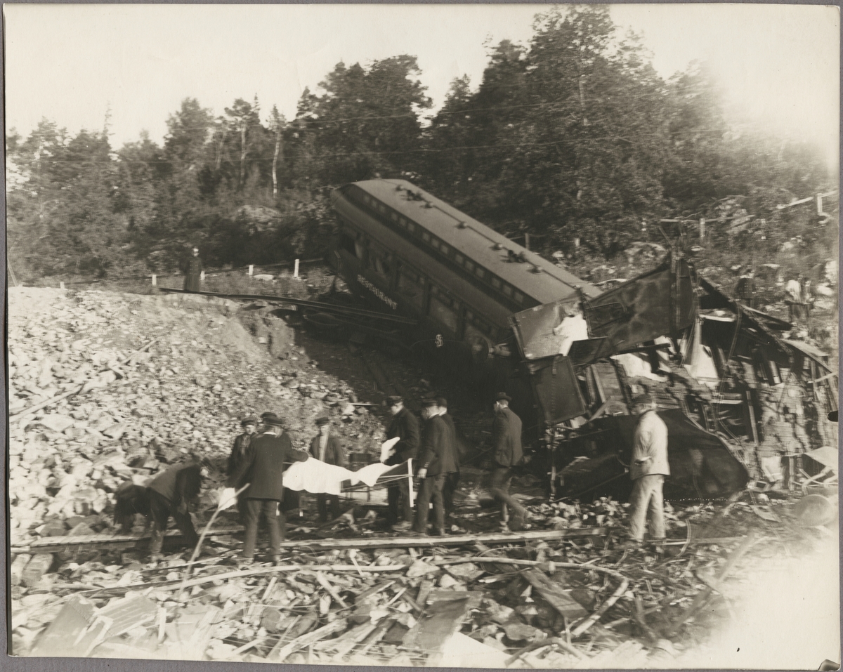 Röjningsarbete efter raset i Getå den 1 oktober 1918. Statens Järnvägar, SJ ABo3 2466 är ett av de drabbade fordonen.