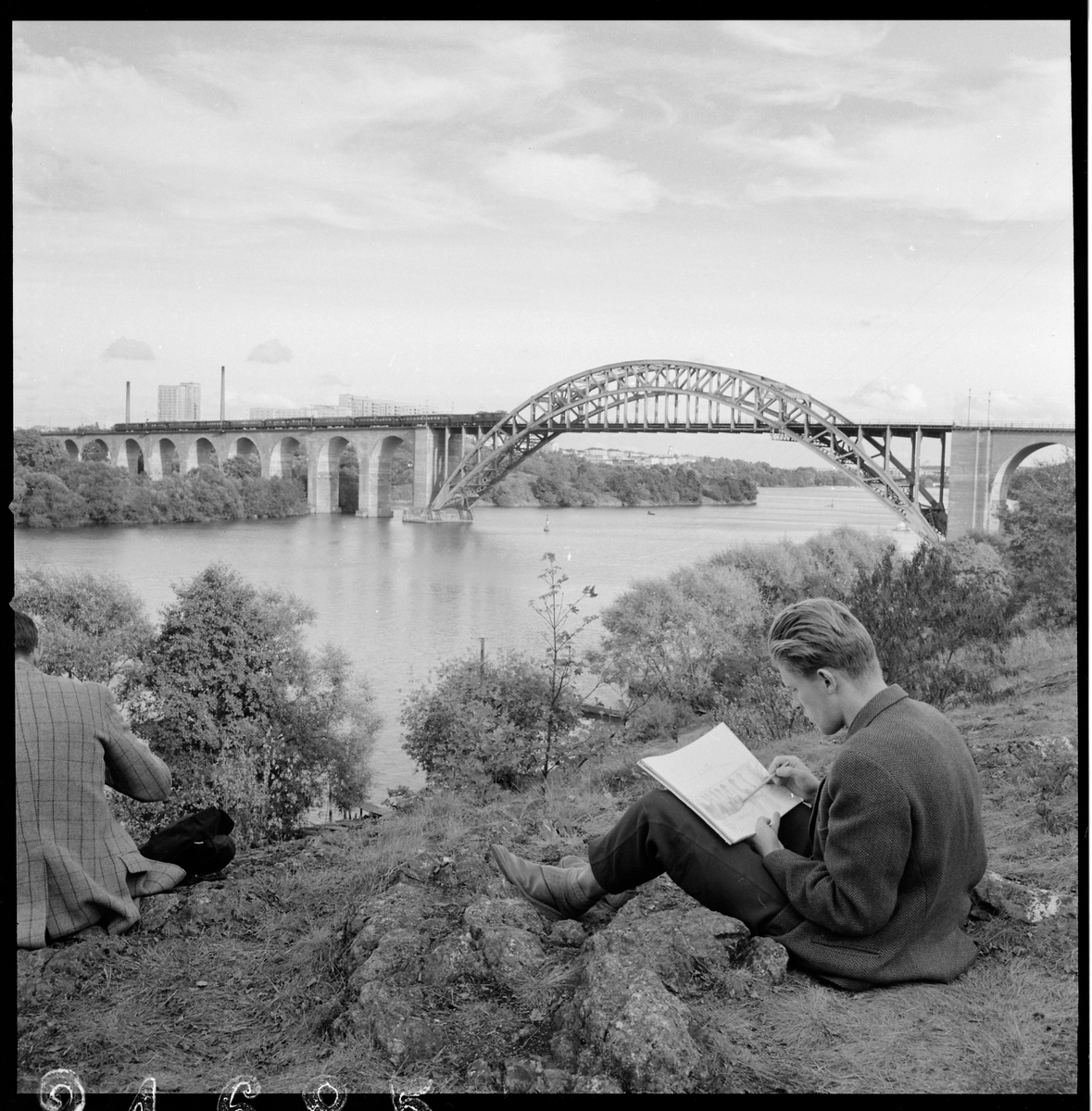 Män tecknar vid Årstabron.