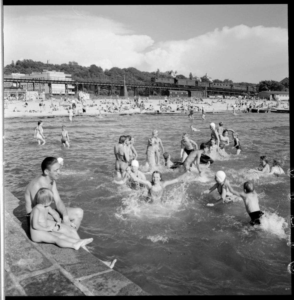 Badstrand i Helsingborg. I bakgrunden passerar ett tåg, på sträckan mellan Helsingborg och Maria.