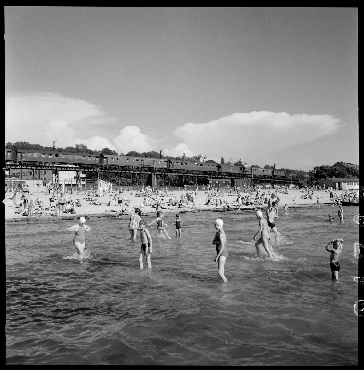 Badstrand i Helsingborg. I bakgrunden passerar ett persontåg, på sträckan mellan Helsingborg och Maria.