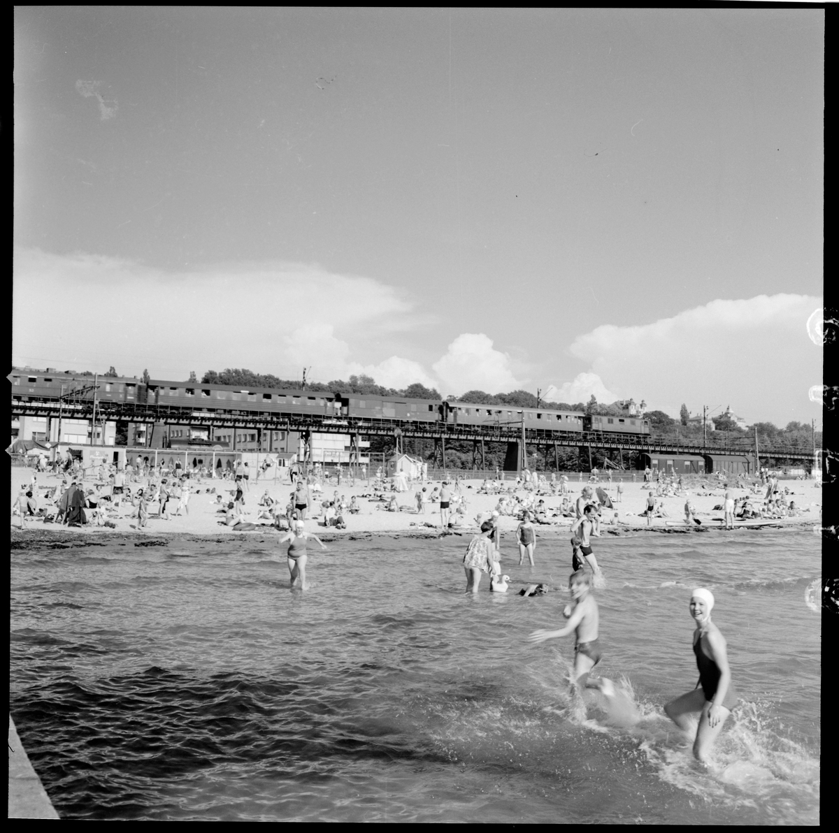 Badstrand i Helsingborg. I bakgrunden passerar ett persontåg, på sträckan mellan Helsingborg och Maria.