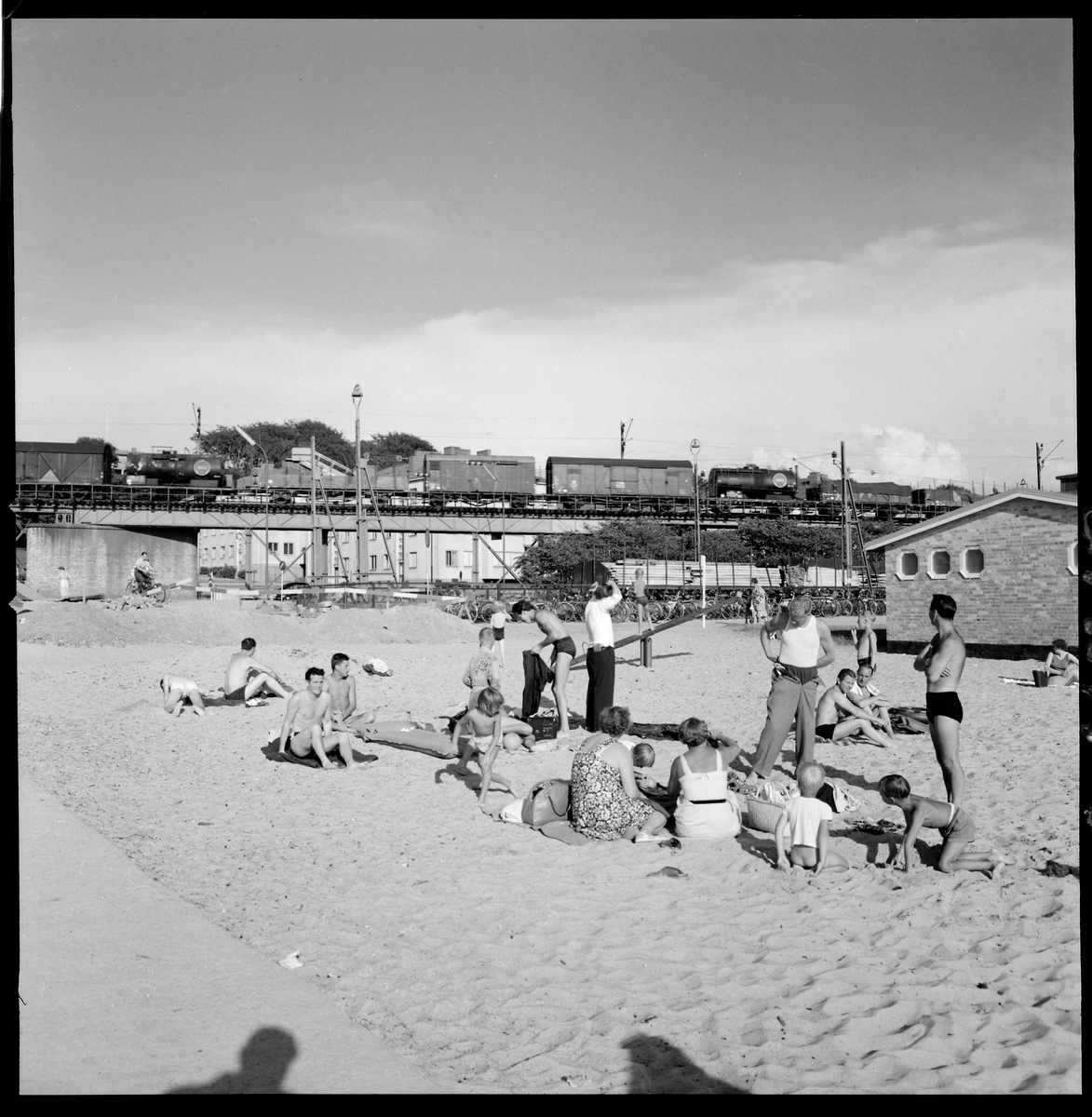 Badstrand i Helsingborg. I bakgrunden passerar ett tåg, på sträckan mellan Helsingborg och Maria.