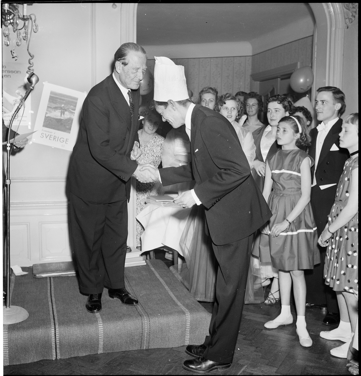 Byråchefen gratulerar segrarna i frågesporten under ett reklamevenemang för Nils Holgersson turen som Statens Järnvägar anordnade.