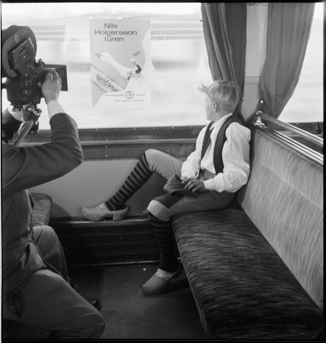 Titel: Alf Larsson som Nils Holgersson blir filmad av veckorevyn.