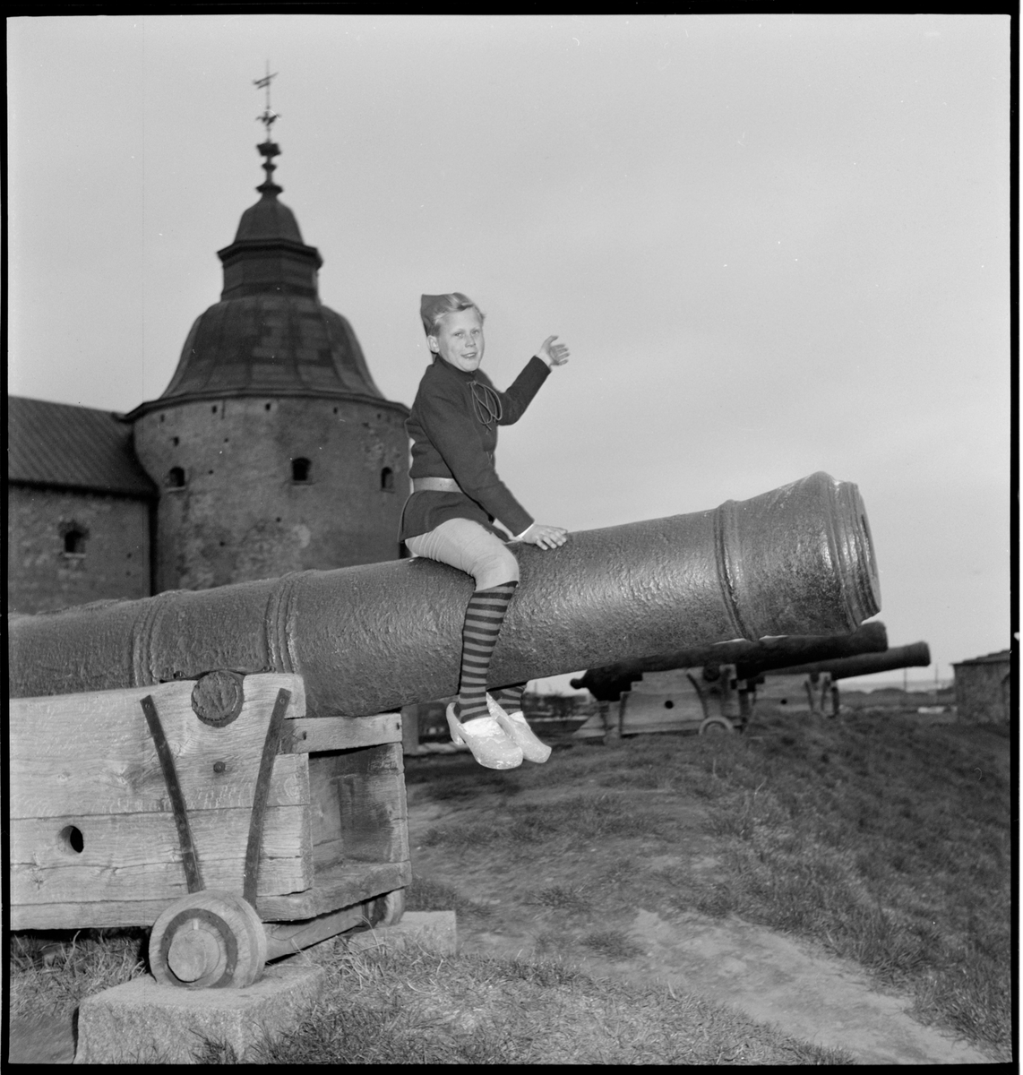 Alf Larsson som Nils Holgersson på en kanon utanför Kalmar slott.