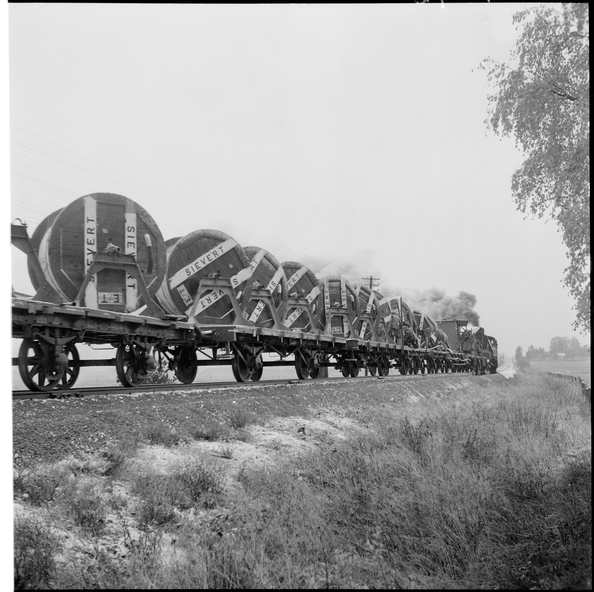 Kabelutläggningståg. Nedplogning av telekabel i banvallen inför elektrifiering av tågdriften.