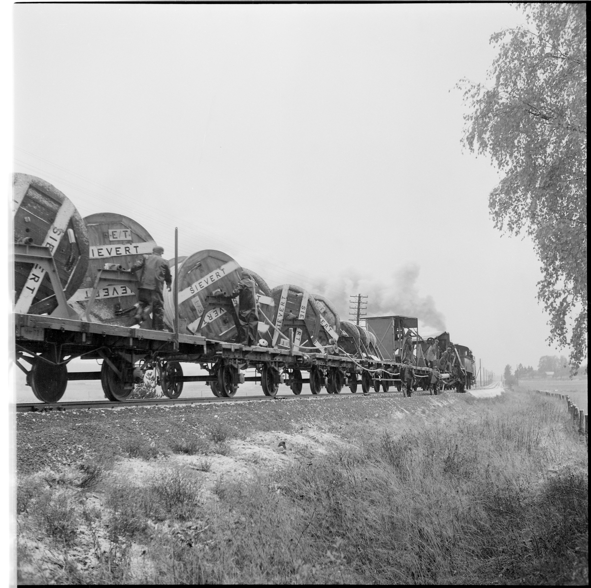 Kabelutläggningståg. Nedplogning av telekabel i banvallen inför elektrifiering av tågdriften.