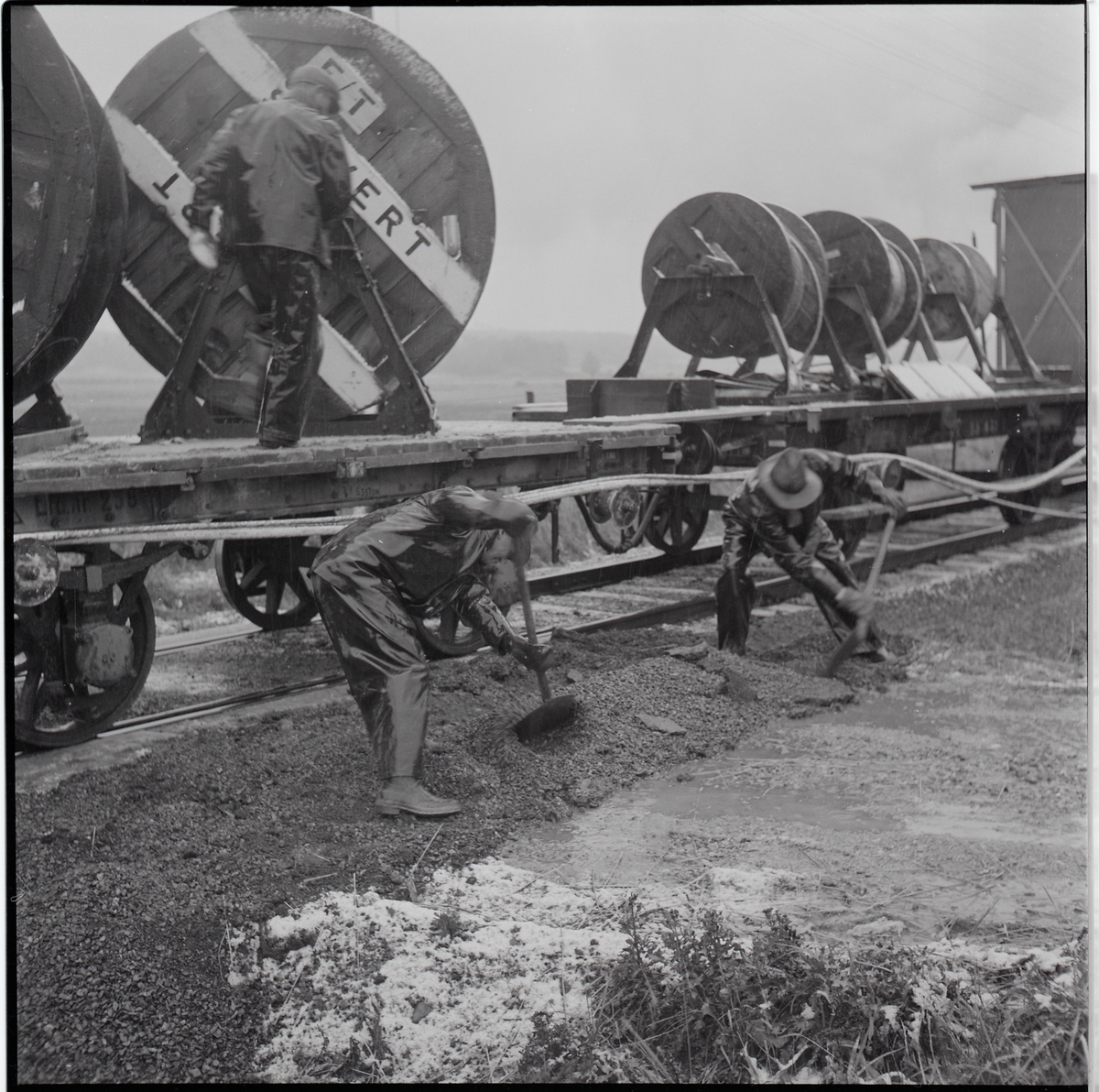Kabelutläggningståg. Nedplogning av telekabel i banvallen inför elektrifiering av tågdriften.