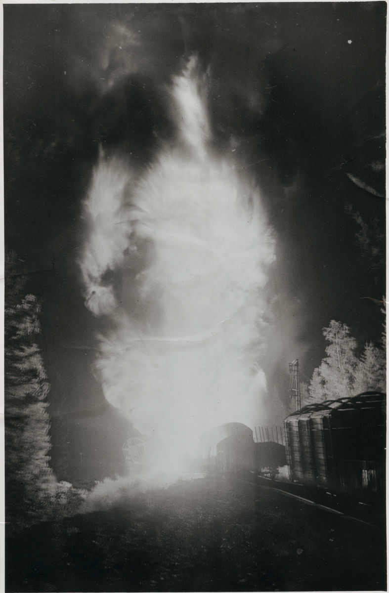 Fat med flytande bränsle exploderar efter linjen mellan Håsjö - Ragunda vid urspårningen 1951-09-23.