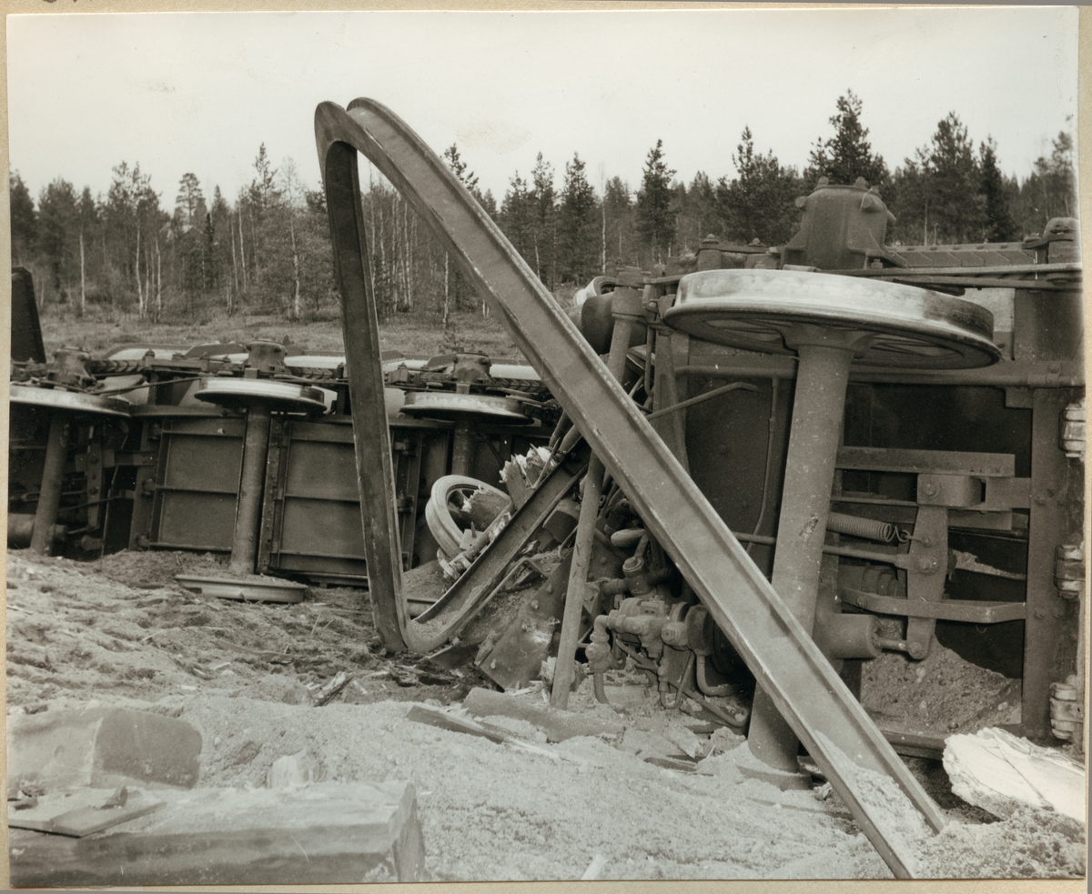 Hjulaxlar tillhörande urspårade malmvagnar vid olyckan i Nattavaara 1953. I förgrunden krökt järnvägsräl.