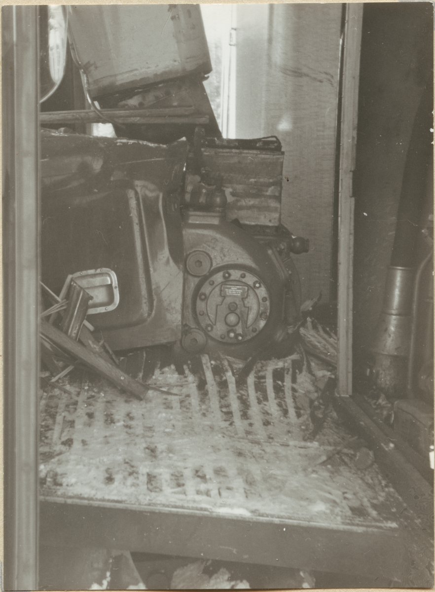 Titel: Del av interiören på rälsbuss Statens Järnvägar, SJ YC06 834 efter olyckan på Koskivaara station 1955.