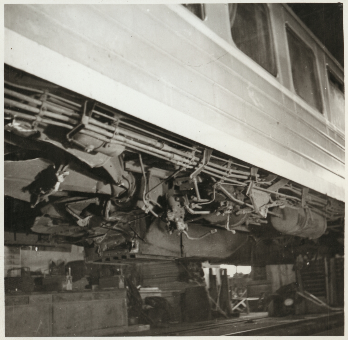 Titel: Skador i underredet på A-vagnen efter olycka vid hållplatsen Arket 1951.