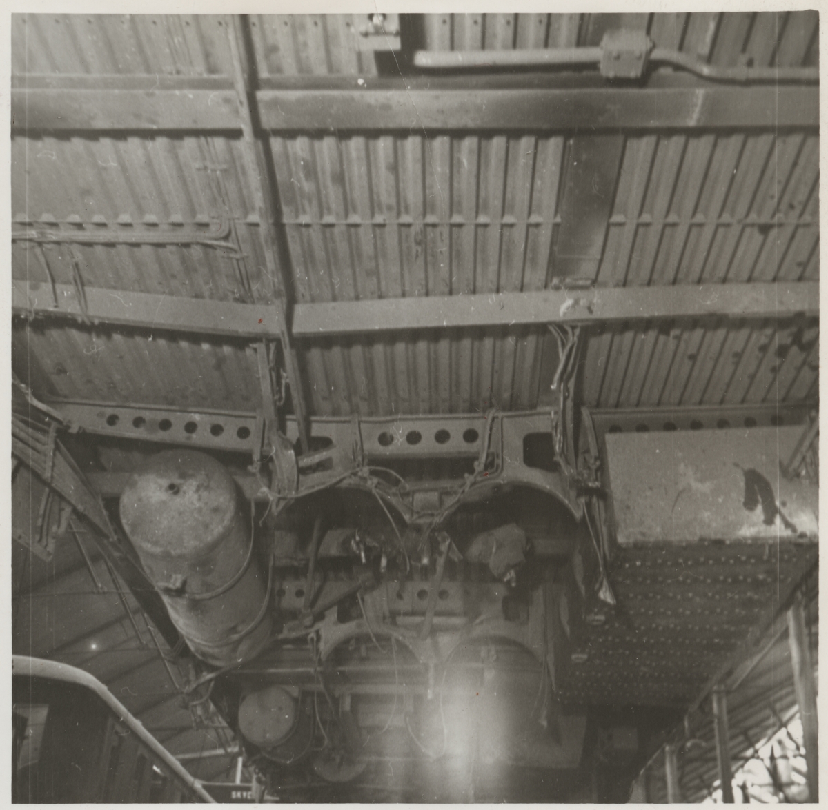 Titel: Skador i underredet på A-vagnen efter olycka vid hållplatsen Arket 1951.