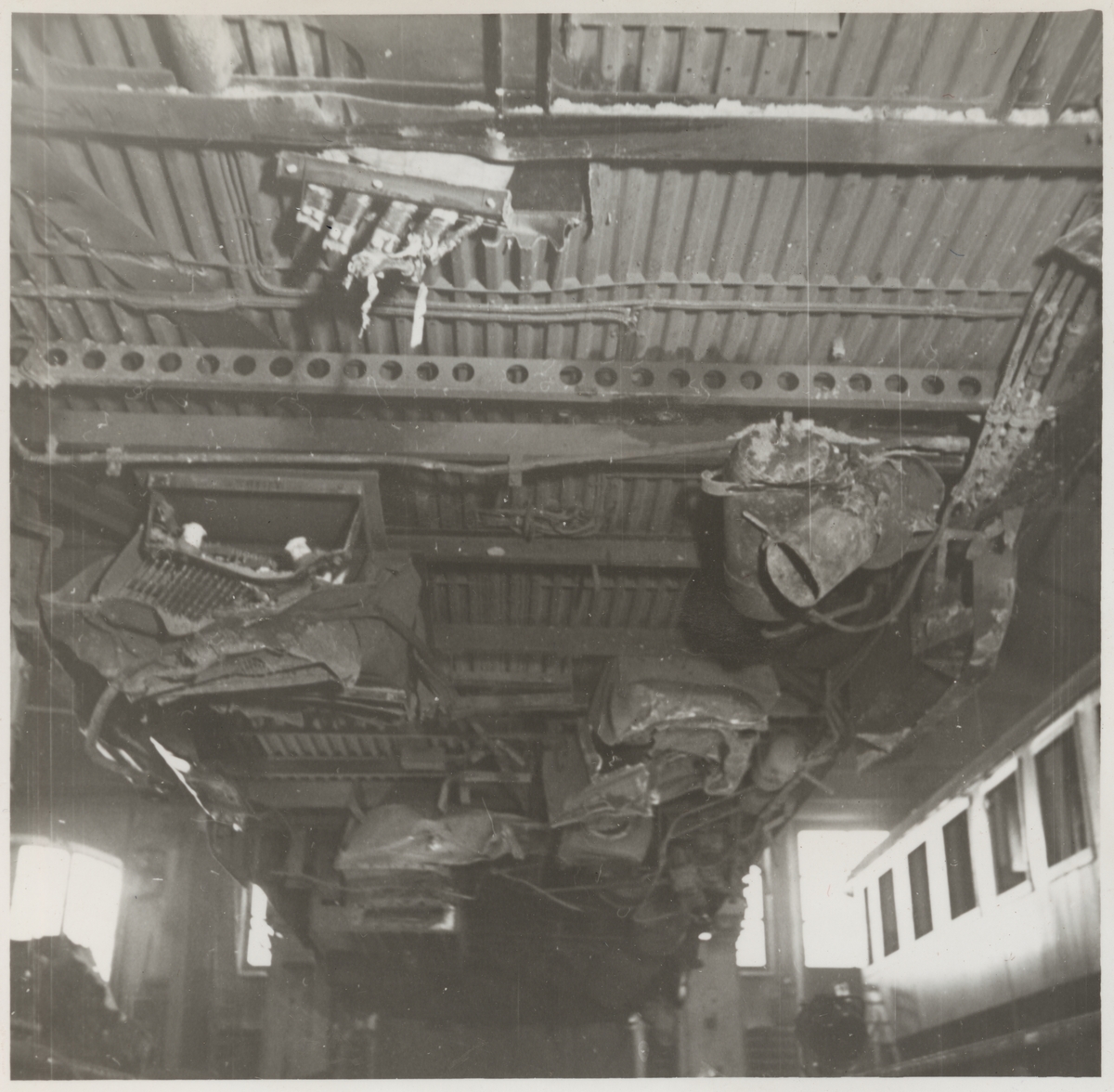 Titel: Skador i underredet på A-vagnen efter olycka vid hållplatsen Arket 1951.
