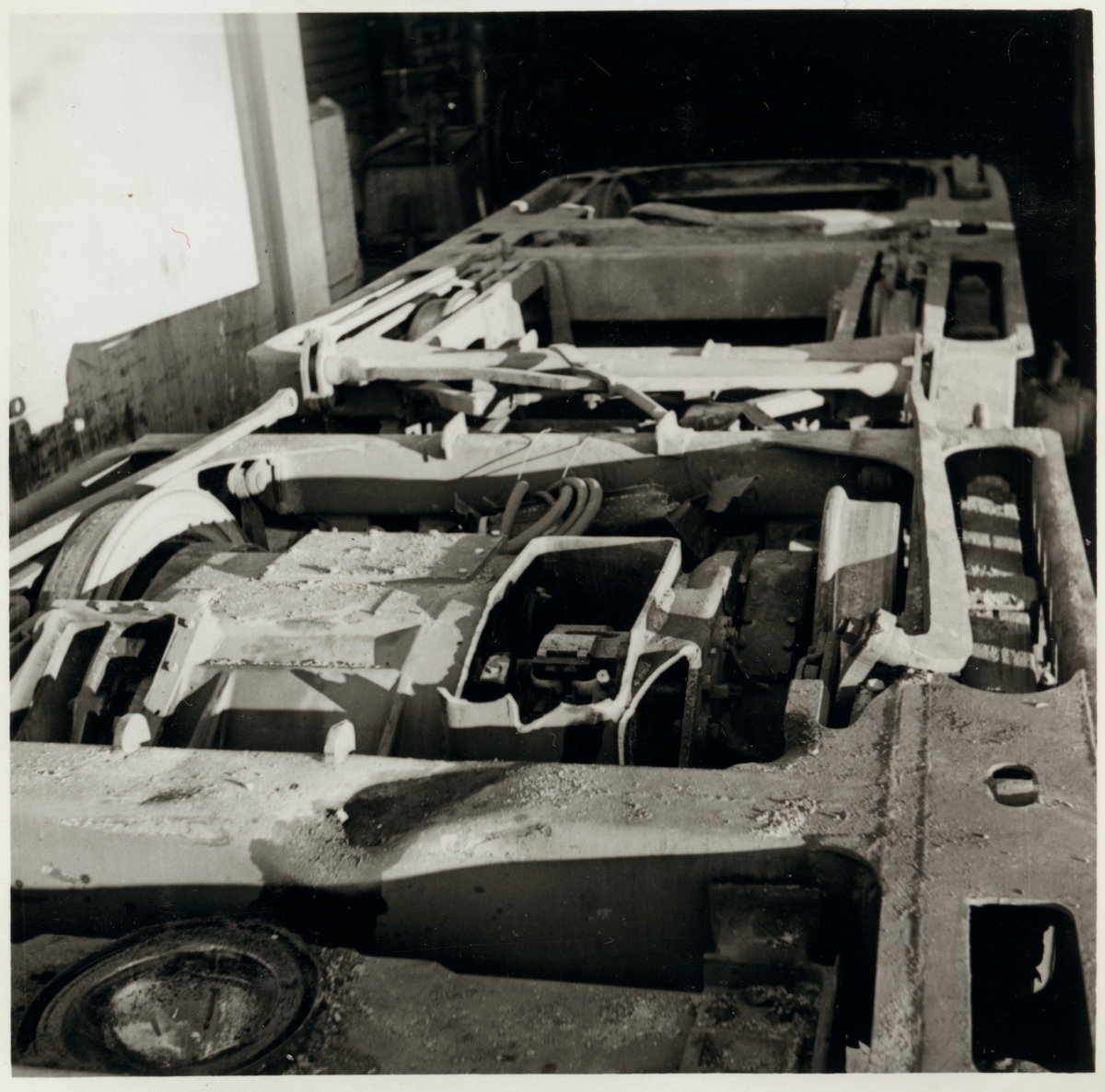 Titel: Skador på motorboggie på A-vagnen efter olycka vid hållplatsen Arket 1951.
