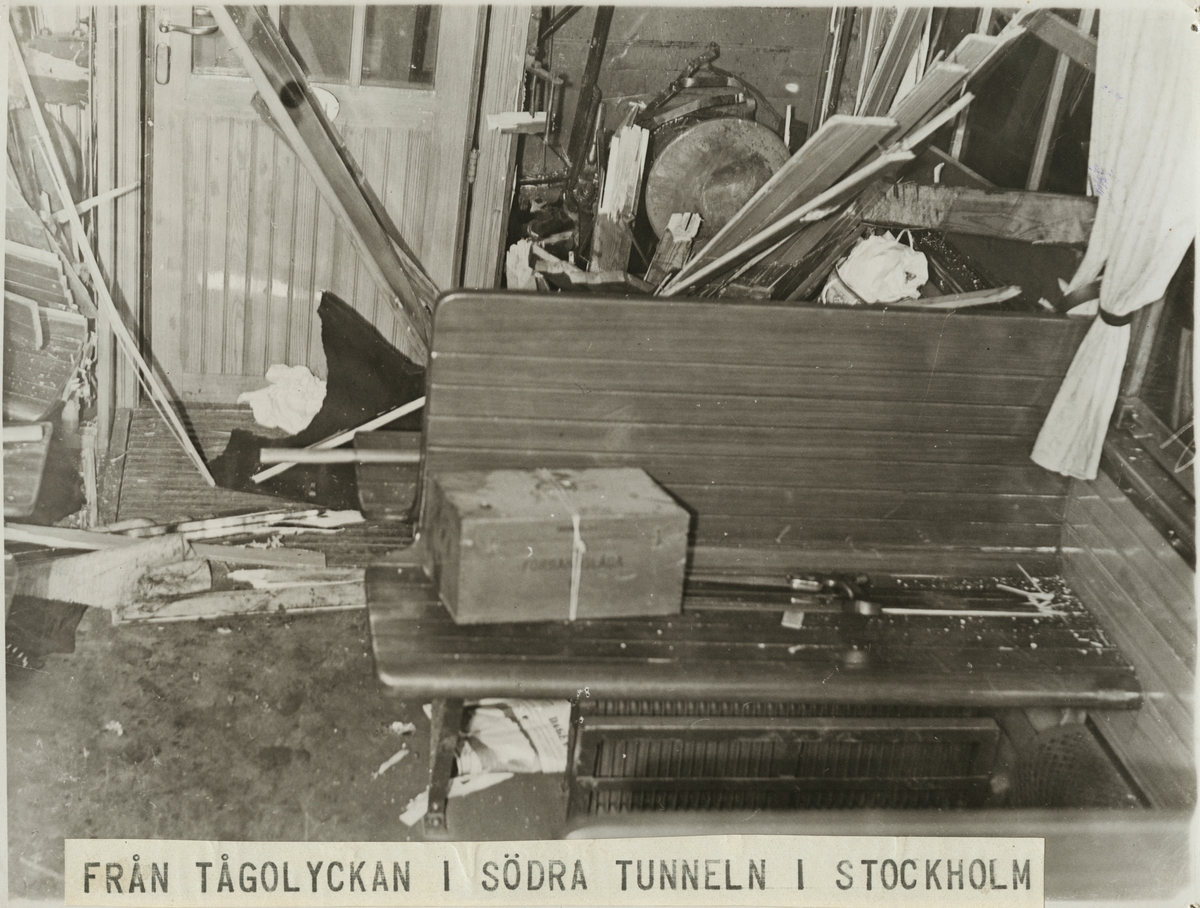 Förstörelse i vagn efter tågolycka i Södertunneln i Stockholm.