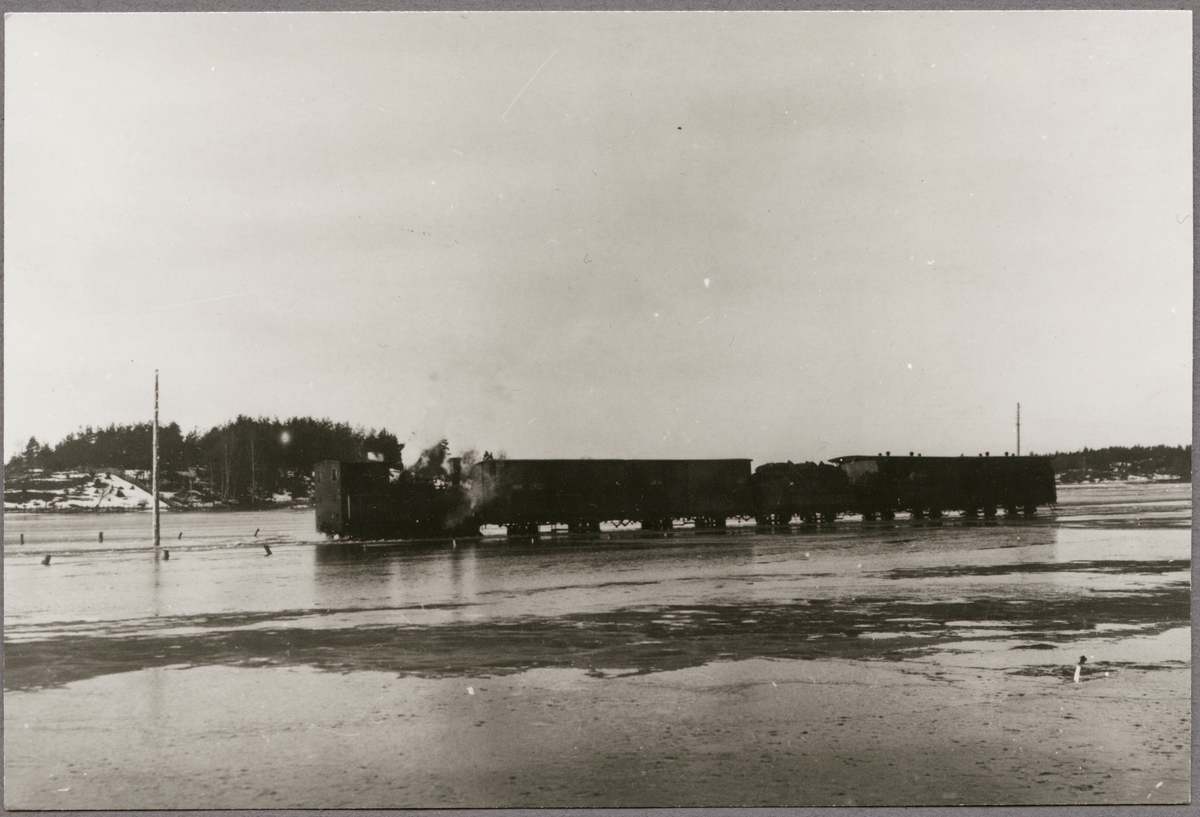 Vikbolandsbanan, VB tåg kör på översvämmad järnväg omkring 1920.