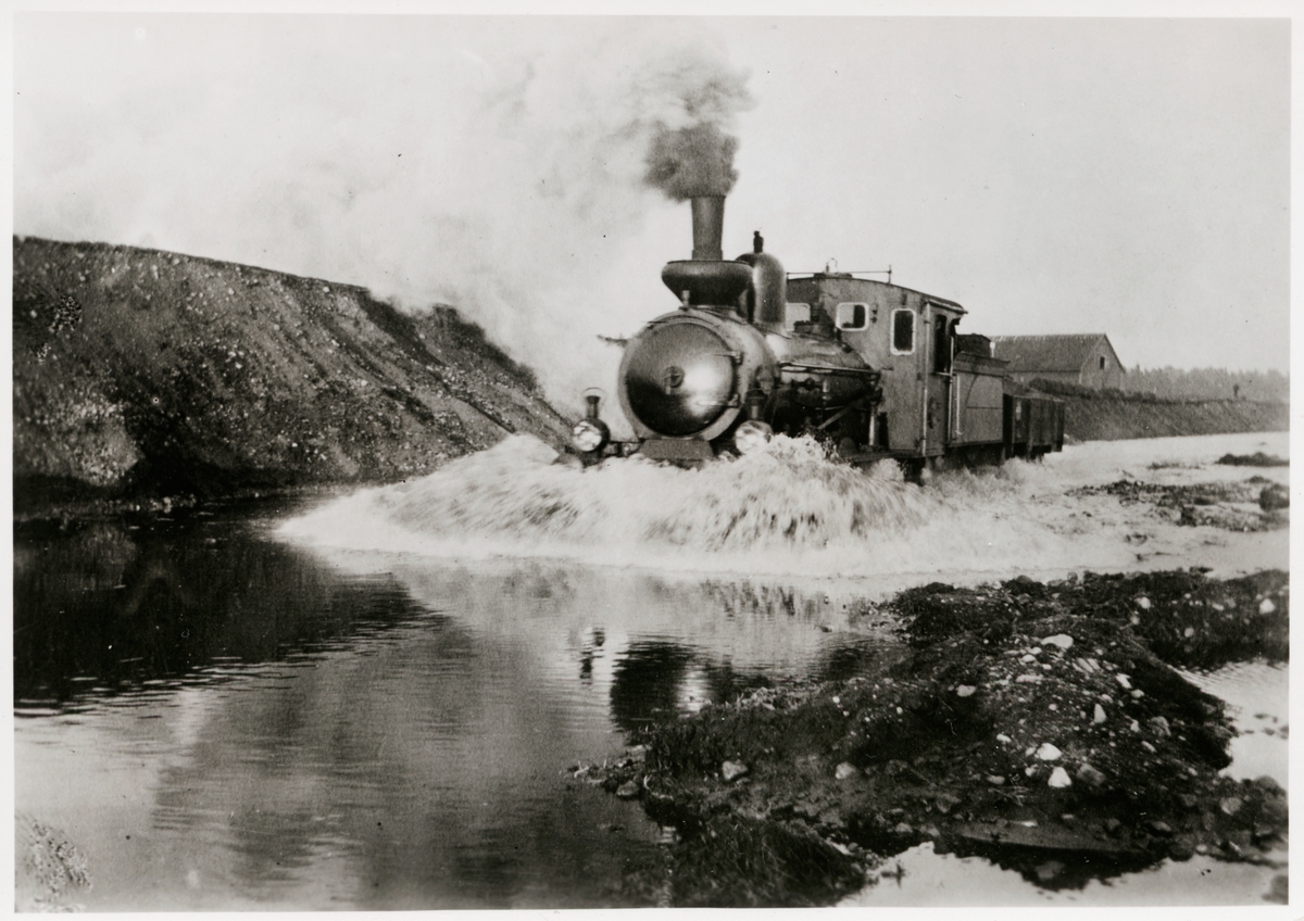 Ånglok kör igenom översvämmning på Malmö Simrishamns Järnväg, MSJ 1910.