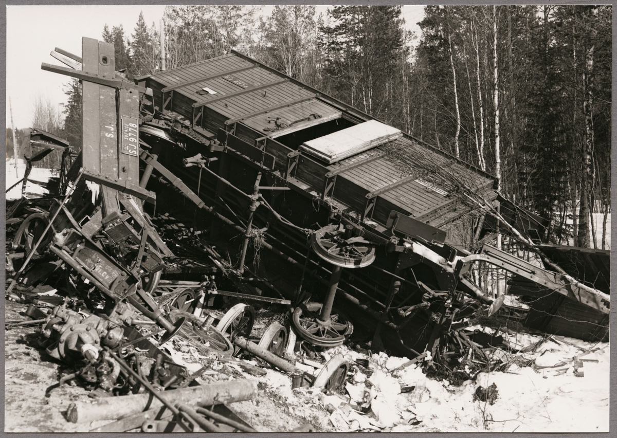 Statens Järnvägar, SJ godsvagn 9778 och SJ godsvagn 8874 liggande efter olycka mellan Gastsjön och Kälarne i Jämtland på 1920-talet.