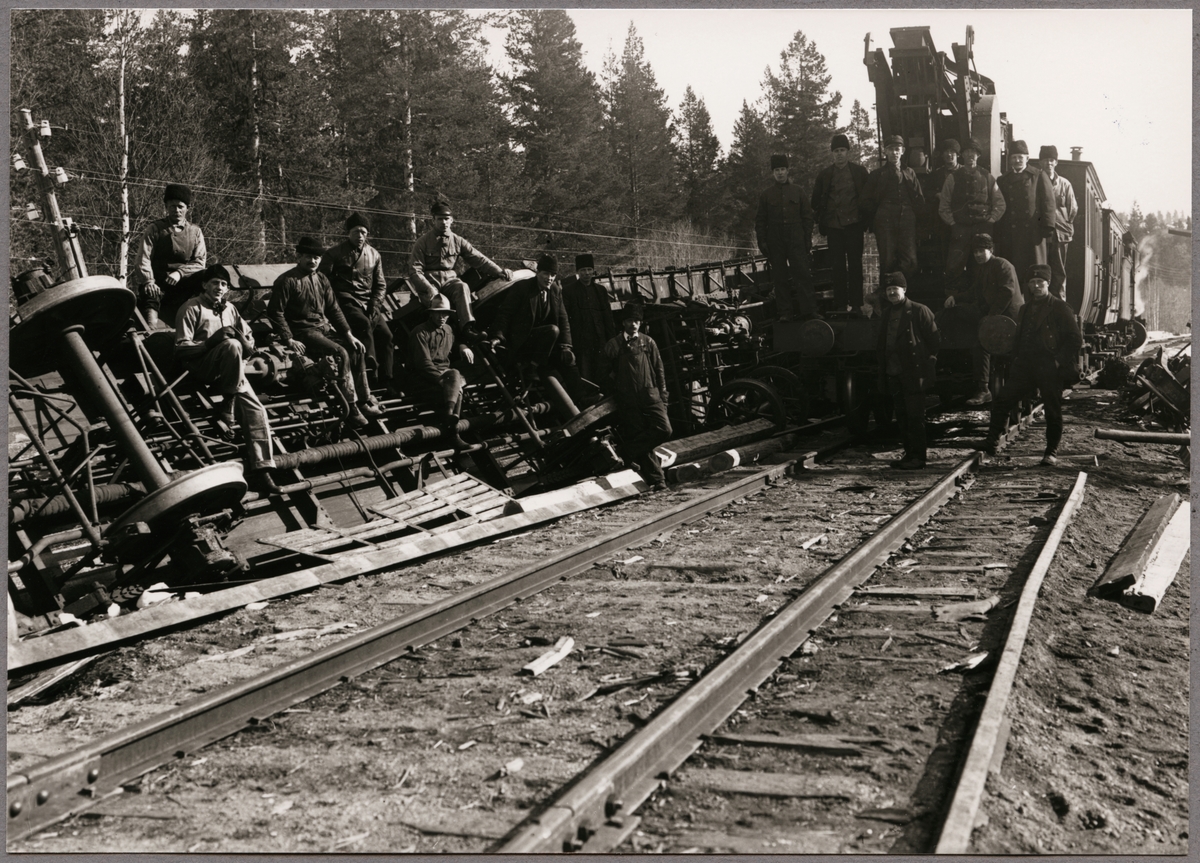 Personal som sitter på liggande godsvagnar efter olycka mellan Gastsjön och Kälarne i Jämtland på 1920-talet.