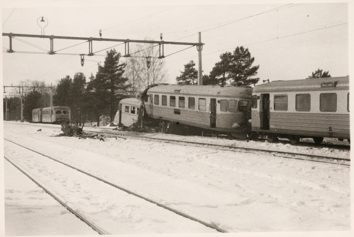 Statens Järnvägar, SJ YBo6 1066 har kört in i SJ Yo1s 620 vid Hinsnorets station mars 1957.