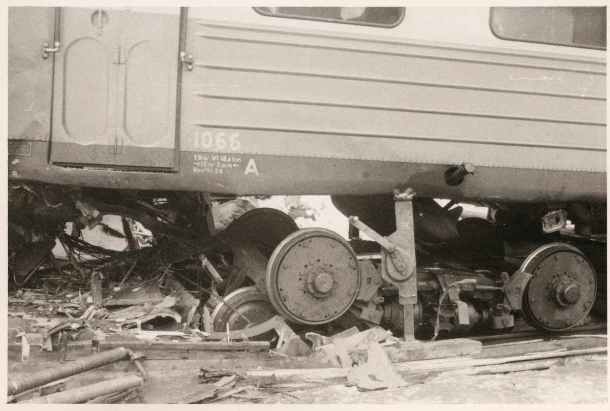 Rälsbuss Statens Järnvägar, SJ Ybo6 1066 skador efter olycka vid Hinsnorets station mars 1957.