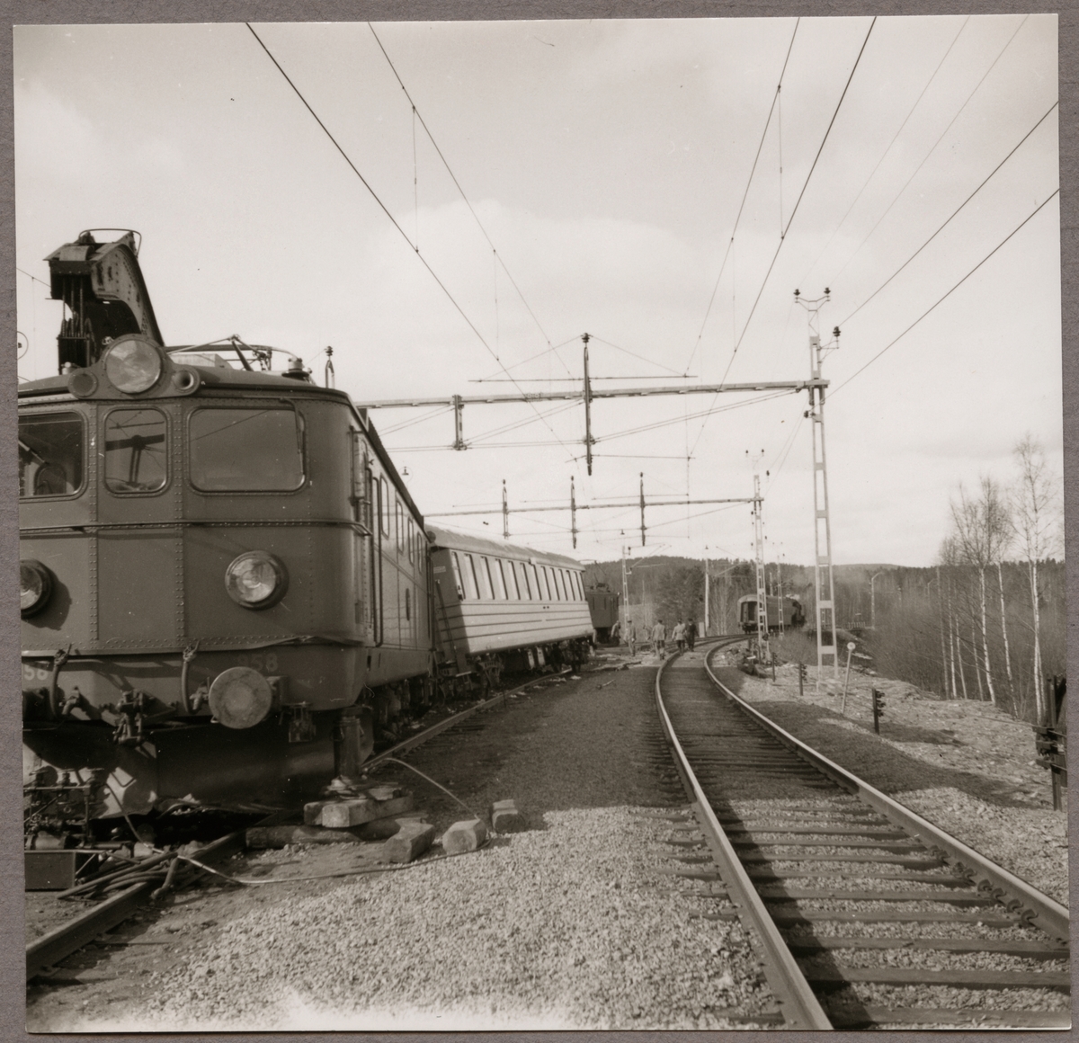Statens Järnvägar, SJ Ma 958 och personvagnar efter urspårning i Simeå mars 1961.