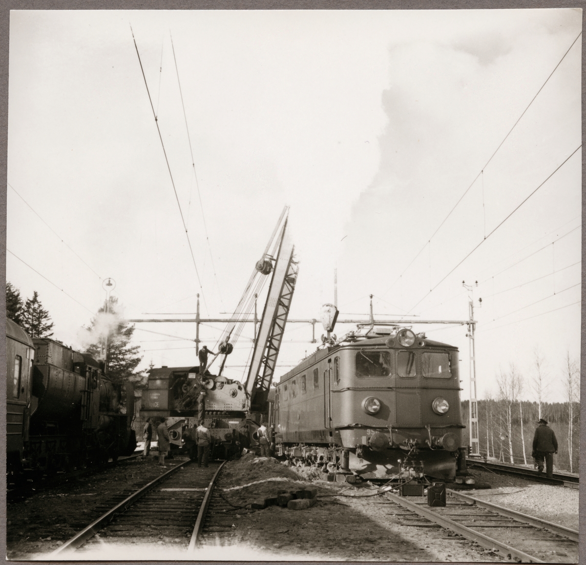 Statens Järnvägar, SJ Ma 958 hjälps av ångkran SJ A2 "Ånge" upp på spåret efter urspårning i Simeå mars 1961.