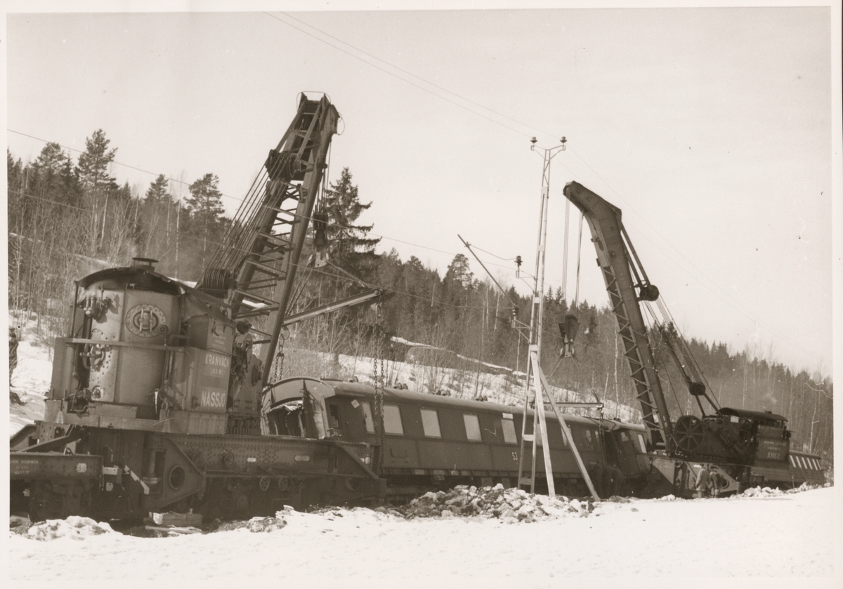 Bärgning av personvagn med ångkran Statens Järnvägar, SJ A1 "Nässjö" och SJ A2 "Ånge"efter olycka mellan Simeå och Karsjö april 1956.