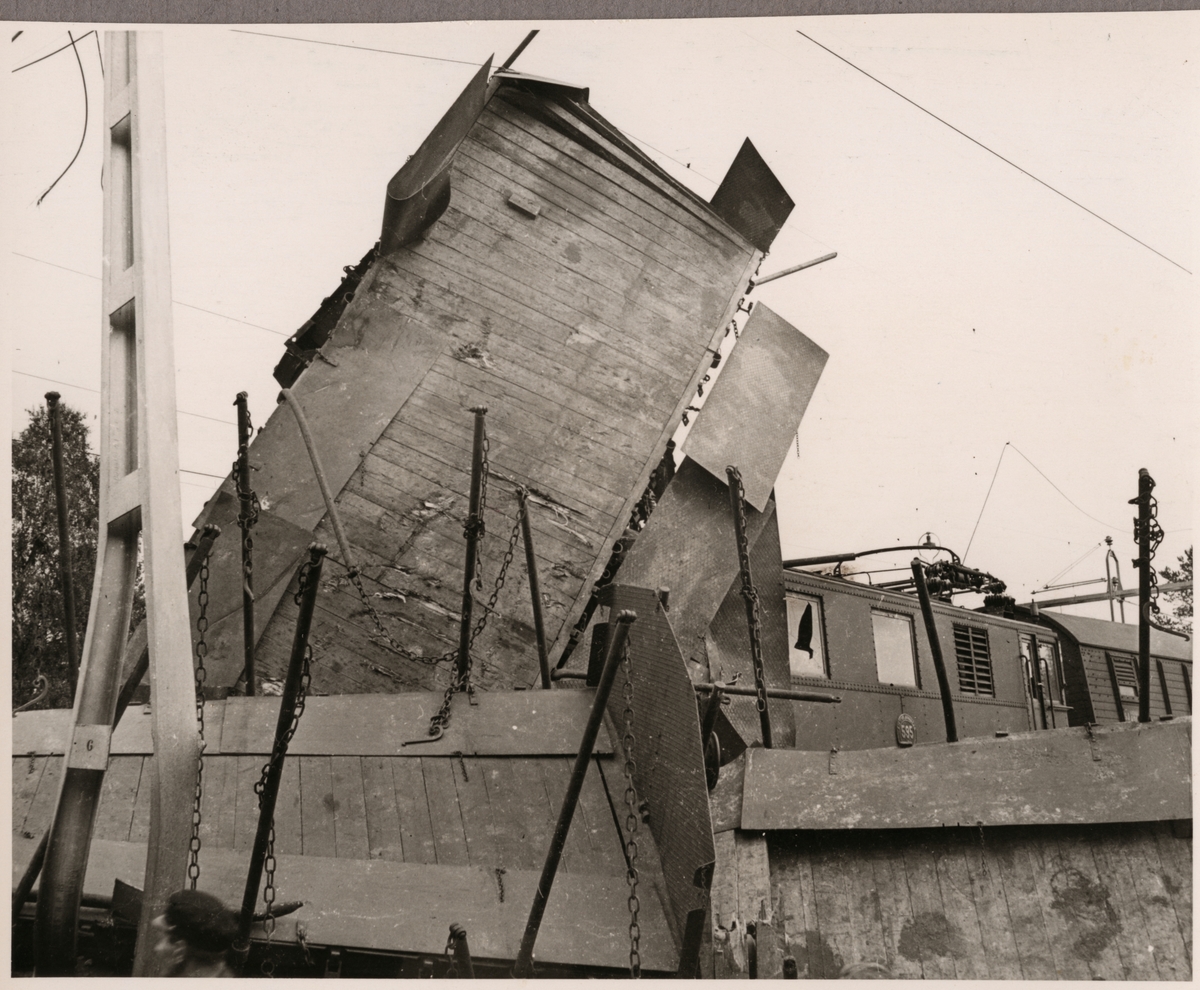 Statens Järnvägar, SJ D 595 med krockskadad godsvagn på taket efter olycka i Mellansjö augusti 1945.
