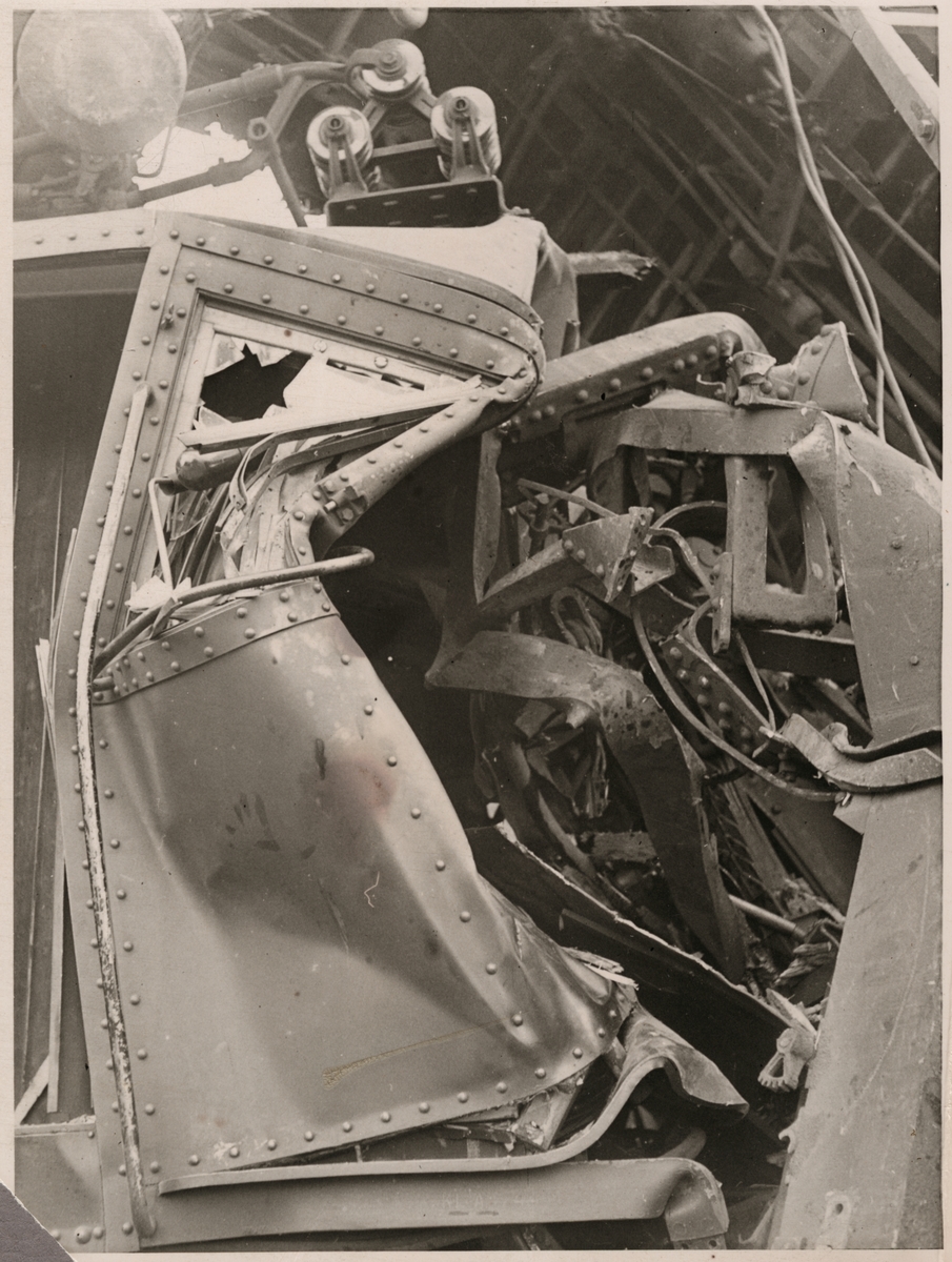 Statens Järnvägar, SJ D 595 skador i förarhytten efter olycka i Mellansjö augusti 1945.