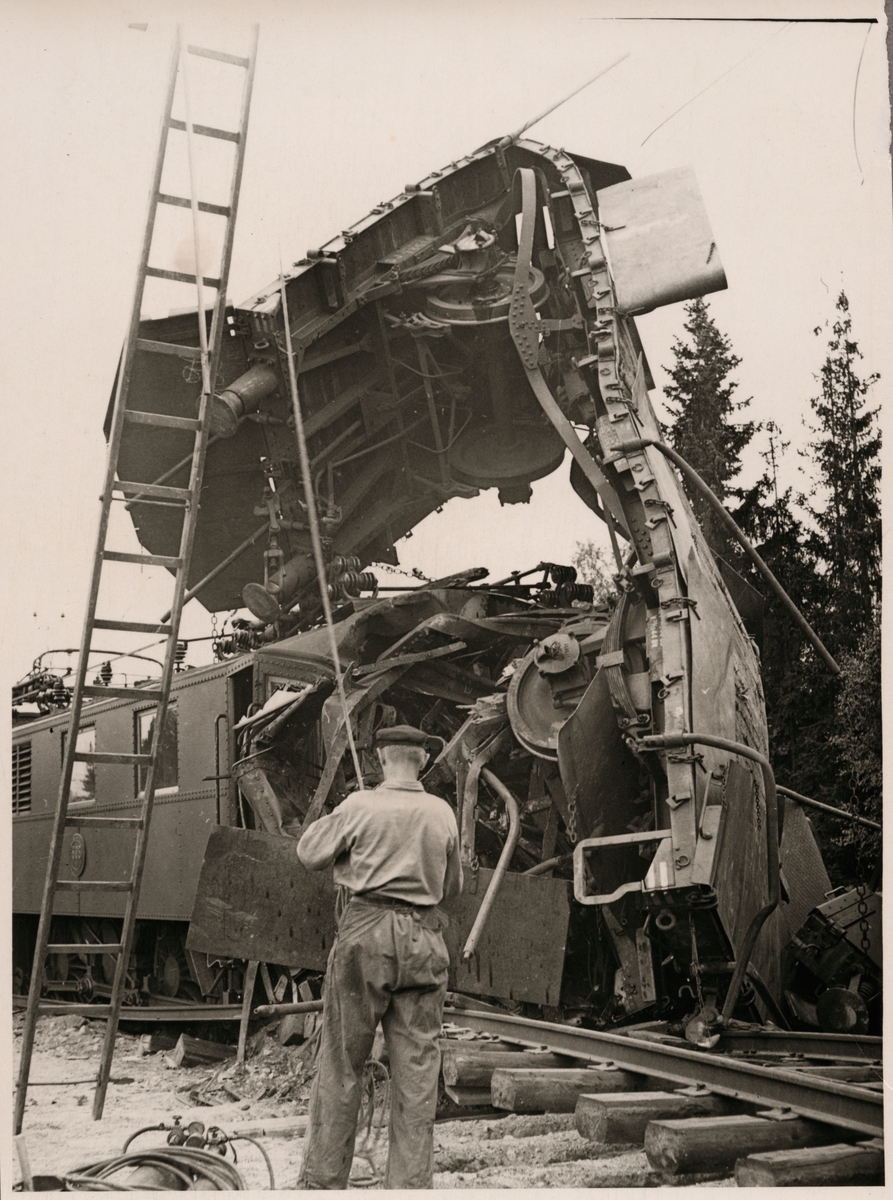 Titel: Statens Järnvägar, SJ D 595 med krockskadad godsvagn på taket efter olycka i Mellansjö augusti 1945.