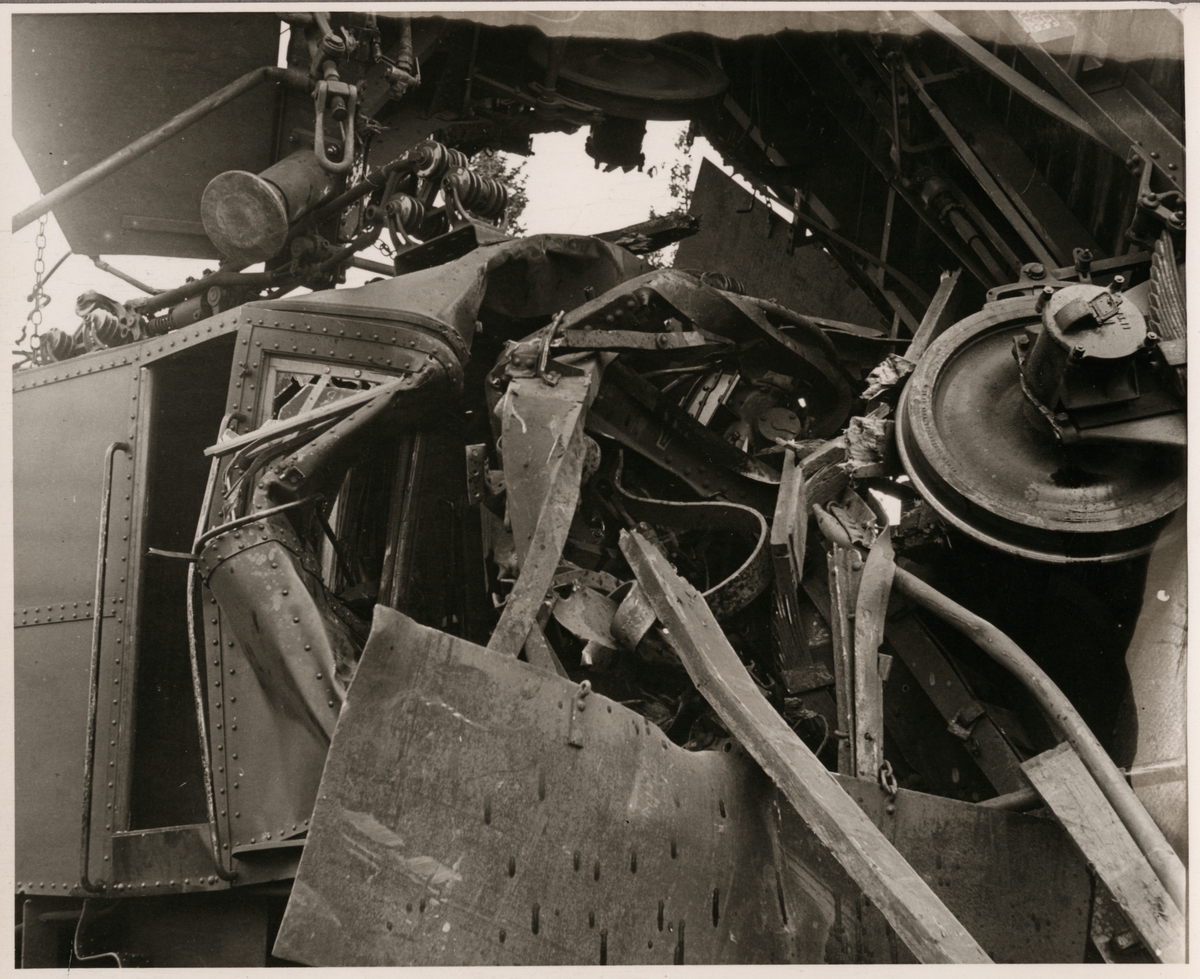 Statens Järnvägar, SJ D 595 med krockskadad godsvagn på taket efter olycka i Mellansjö augusti 1945.