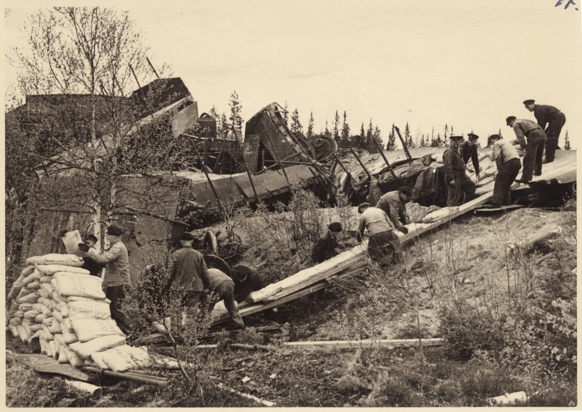 Urspårning vid Älvho 1950. Lossning av cement.