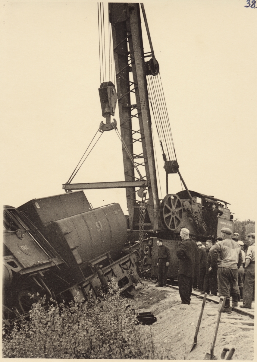 Urspårning vid Älvho 1950. Ångkran försöker lyfta tendern på Statens Järnvägar, SJ E10 1744.