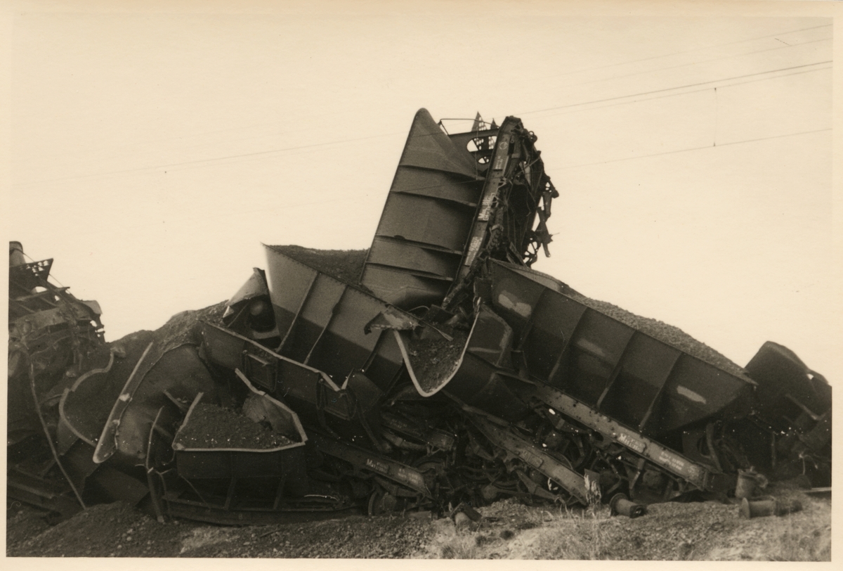 Godsvagnar med malm som står på varandra och på högkant efter olycka i Nattavaara i september 1953.