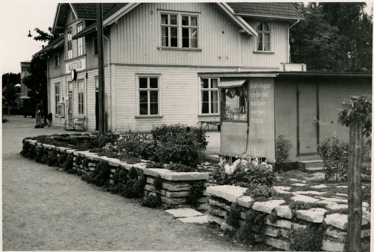 Stations trädgårdsplantering. Sölvesborg - Olofström - Älmhults Järnväg öppnades 1901 för allmän trafik. Samma år anlades station. Då byggdes en- och enhalvvånings stationshus i trä. Järnvägen förstatligades 1942. På 1950-talet ersattes stationshuset med en nybyggnad öster om banan. Stationen och hela bangården är anpassade efter industriomgivningen bland annat Svenska stålpressnings, plåtpressverk, emaljeringsverk, träullfabrik, såg, kvarn och kraftverk. Persontrafiken lades ned 1984 och bandelen Sölvesborg - Olofström revs upp. Idag trafikeras bandelen Olofström - Älmhult med godståg från Volvo till Göteborg och gent samt tåg med skrot från Volvo av Stena Metall.