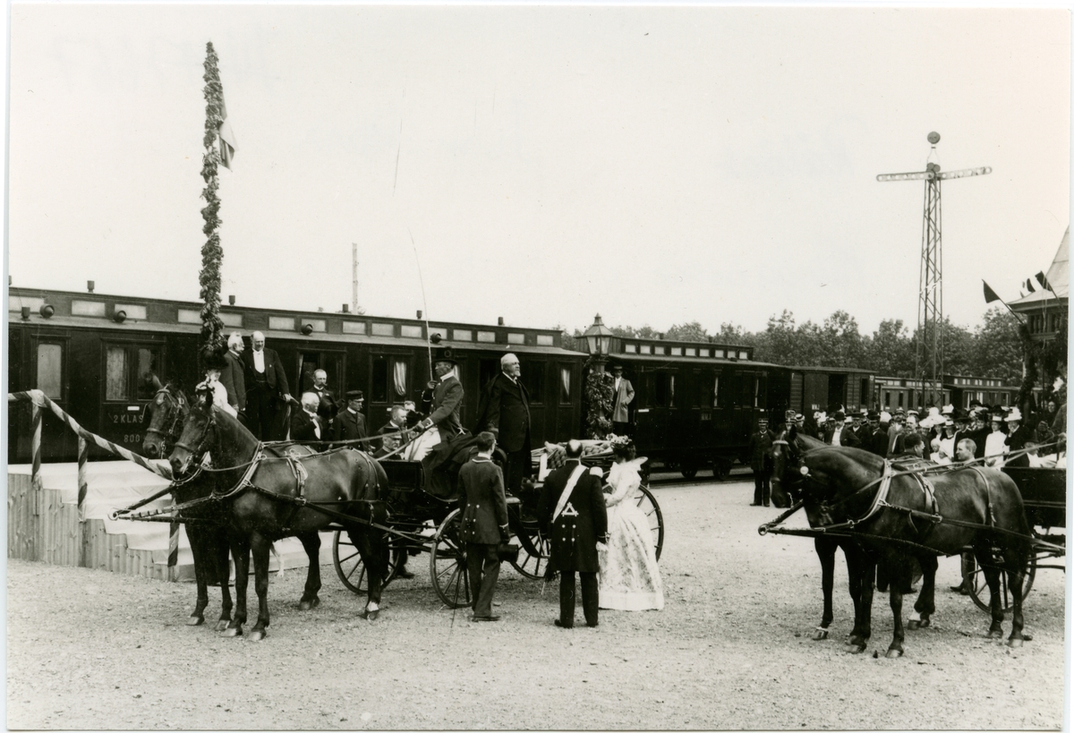 Oscar II med drottning Sofia besöker Råbäcks station.