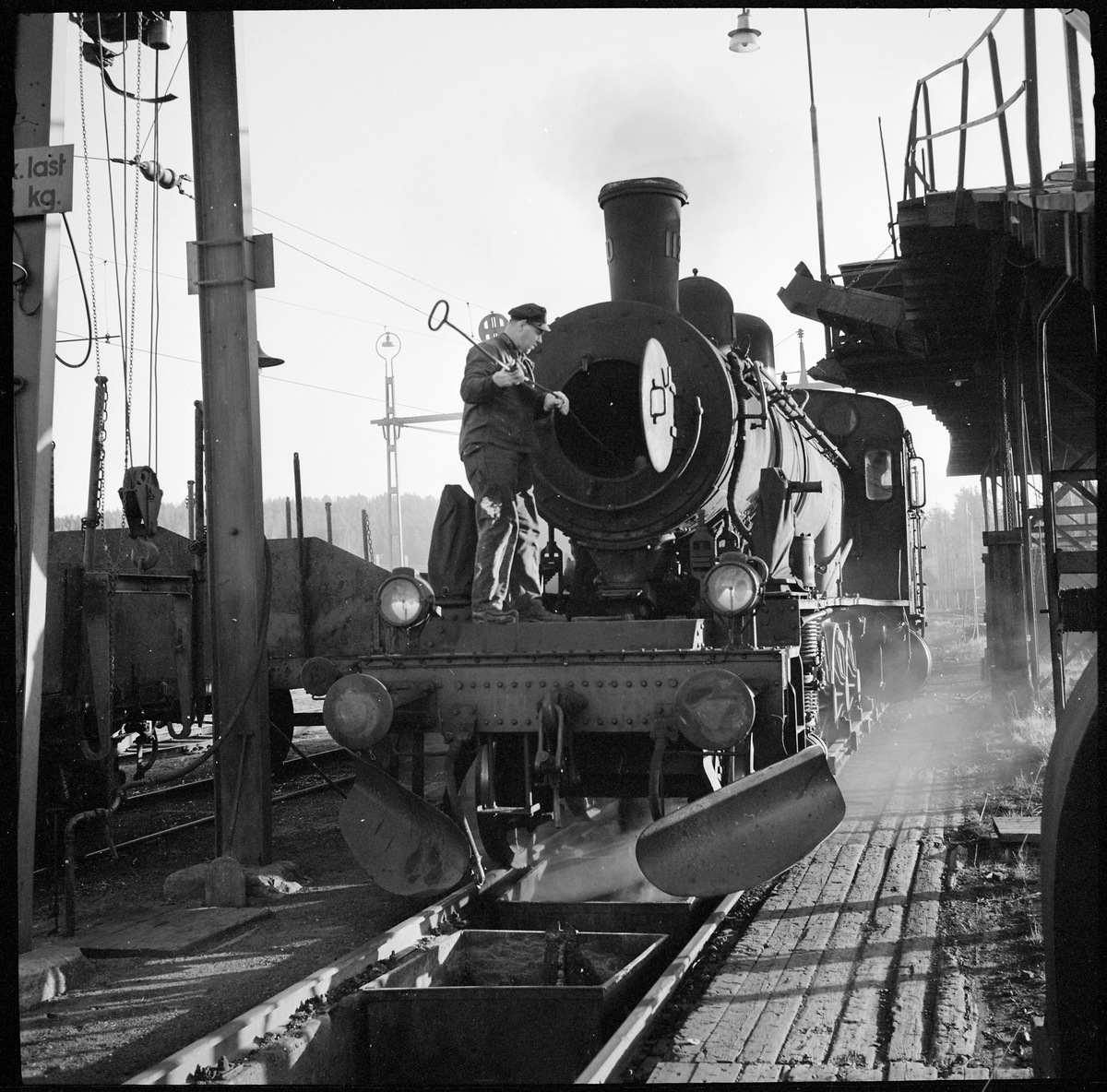 Karl Johnsson gör ren i sotskåpet på SJ E2 1120. Statens Järnvägar.