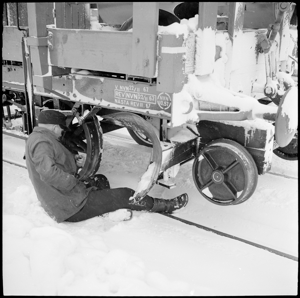 Ture Ekman byter sönderkörd kniv på spårrensaren på sträckan Hoting-Dorotea.