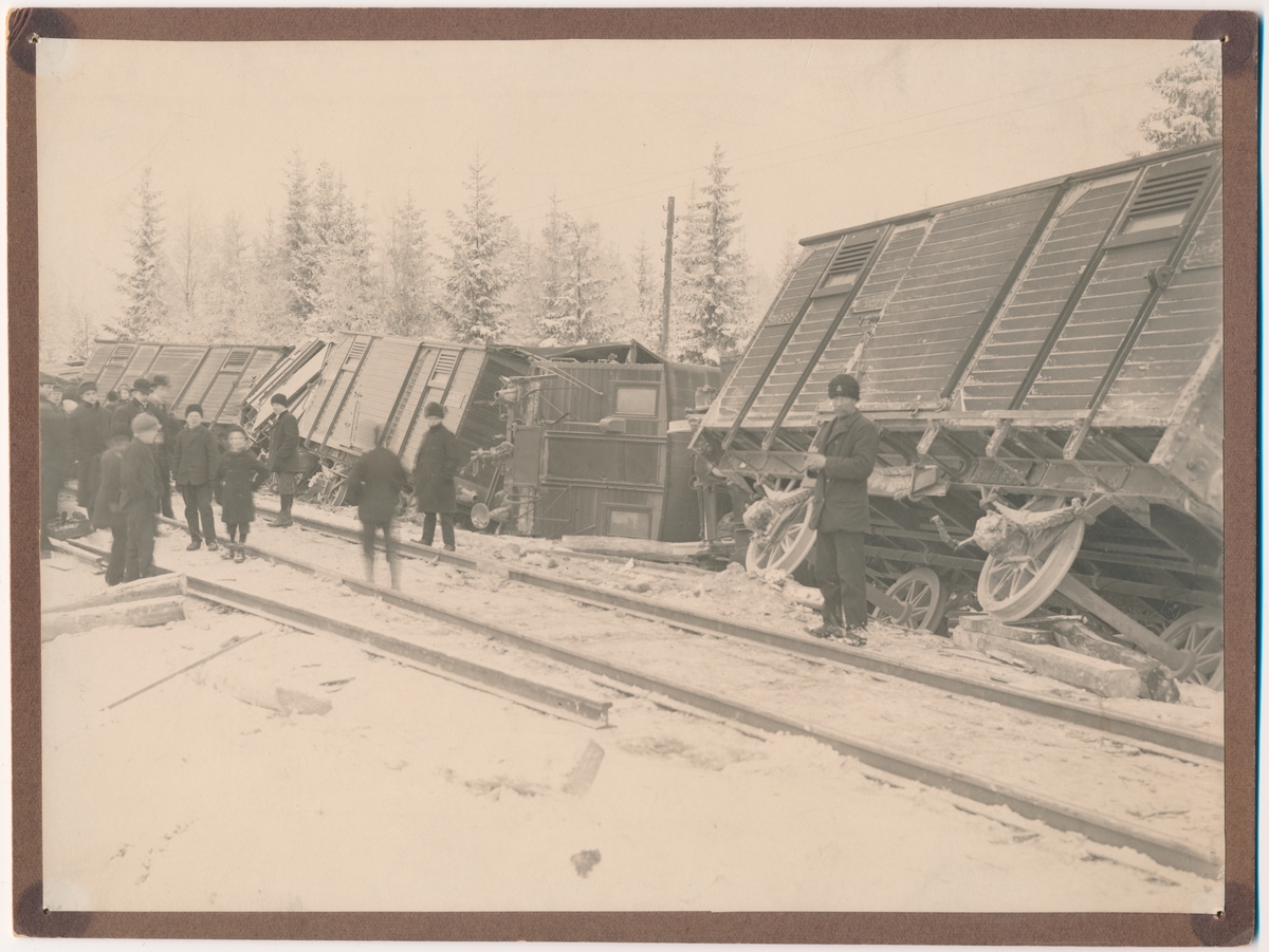Text påkortet - Tåg nr 751 urspårade å linjen Lamhult - Lidnäs den 27/1 1912 varvid spåret fullständigt upprevs. 190 meter och28 vagnar urspårade. Olyckan orsakades av att en hjulring å en vagn sprang sönder.