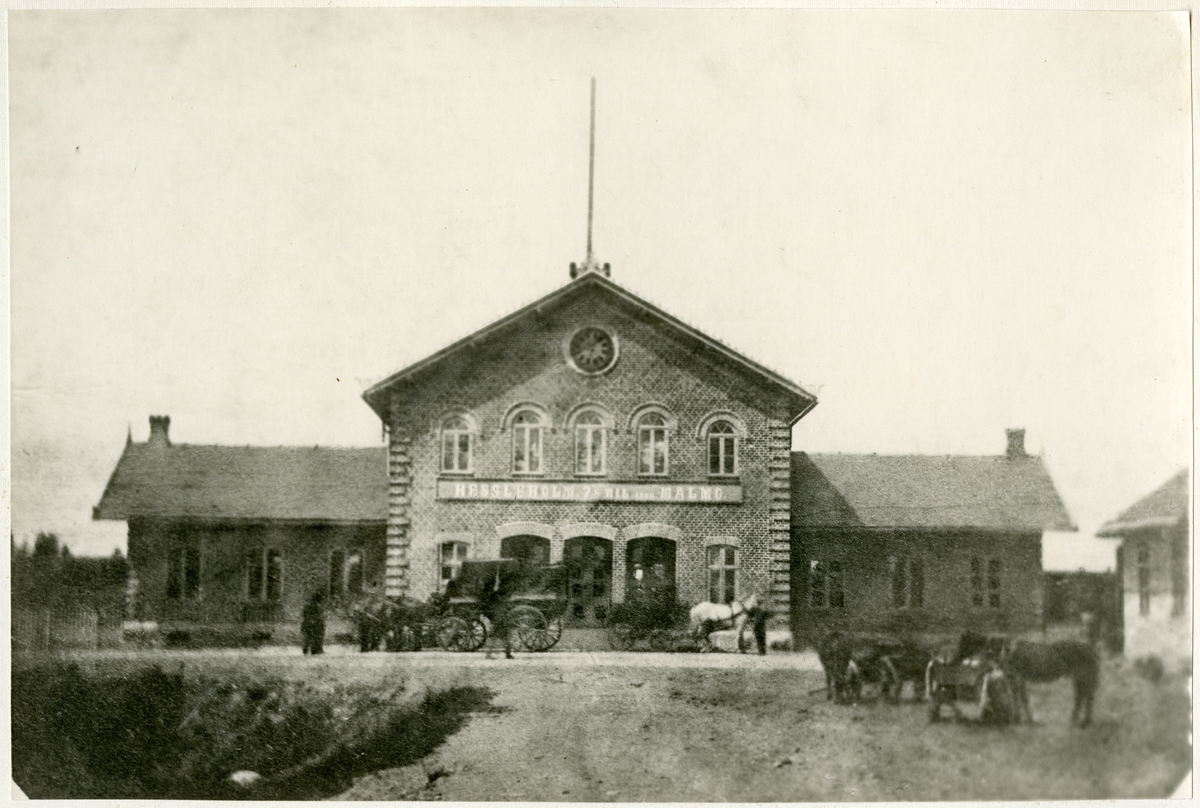 Tvåvånings stationshus i sten, byggt 1863. Tillbyggt 1876 och 1890 . Nytt stationshus i tegel 1919, invigt 1921 ,1914 uppfördes, som ett provisorium under ombyggnadstiden, en stationsbyggnad söder om den nuvarande. Den ligger år 1991 kvar och används av Postverket . Vid södra infarten låg SJ:s växtdepå. Ett äldre lokstall ersattes av ett sjuportars med vändskiva.