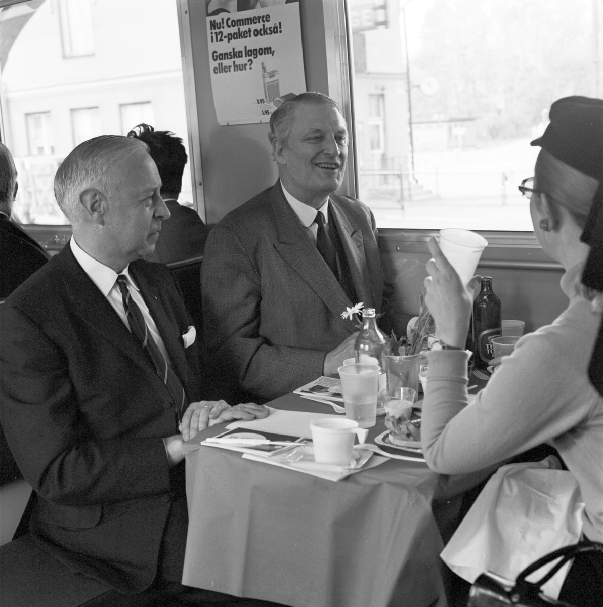 Statens Järnvägar SJ X1. Trafikstart för X1:orna inom AB Storstockholms Lokaltrafik. Generaldirektör Upmark med flera i restaurangvagnen.