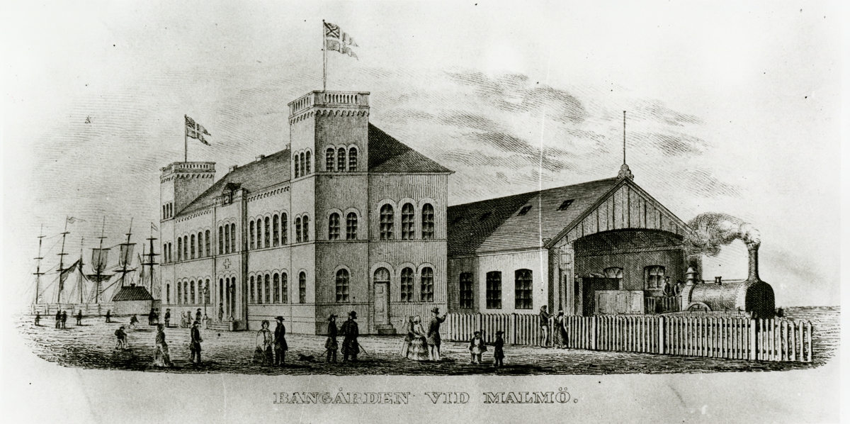 Bangården vid Malmö station. Malmö Central station. Från 1856 till 1864 hade södra stambanan öppnats i etapper. Stambanan från Malmö till Lund öppnades för trafik 1856-12-01. Första stationshuset i sten med banhall byggdes 1855-56 av en okänd dansk arkitekt, möjligen C.F.Rasmussen. Byggnaden förstördes till stor del redan tio år senare, den 14 december 1866, vid en anlagd brand. 1878 färdigställdes en stor utvidgning av spårsystemet, stallcirkel tillkom, reparationsverkstaden och godsmagasinet utvidgades. Anslutning av enskilda järnvägar till Statsbanans egen växande trafik. Det nya stationshuset och banhallen blev färdiga 1981. Arkitekt var A W Edelsvärd. Stationshus är K-märkt 1986. Dubbelspår mellan Malmö och Arlöv öppnades för allmän trafik 1896. För att följa efter trafikens utveckling har stationen genomgått flera utvidgningar och moderniseringar. Stationen kallas Malmö Central från 1926-05-15. Fick eldrift 1933.