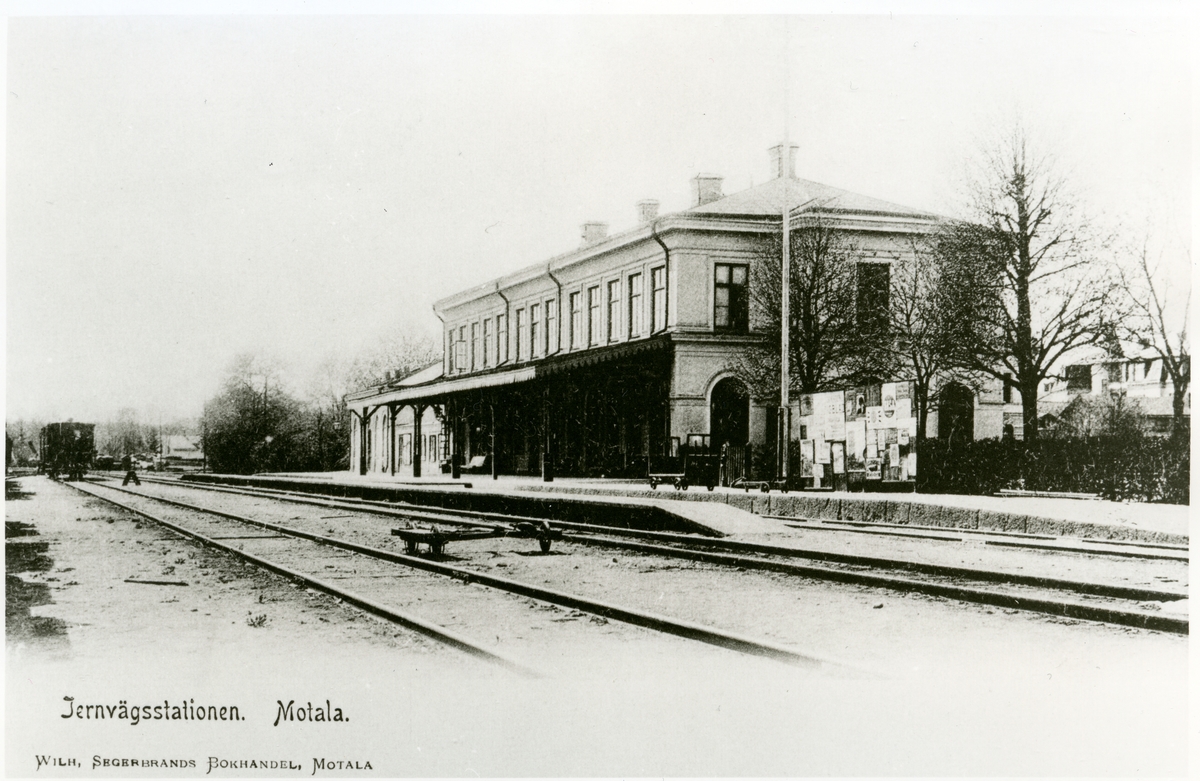 Kopia av vykort av järnvägsstationen i Motala av Wilh. Segerbrands bokhandel Motala.