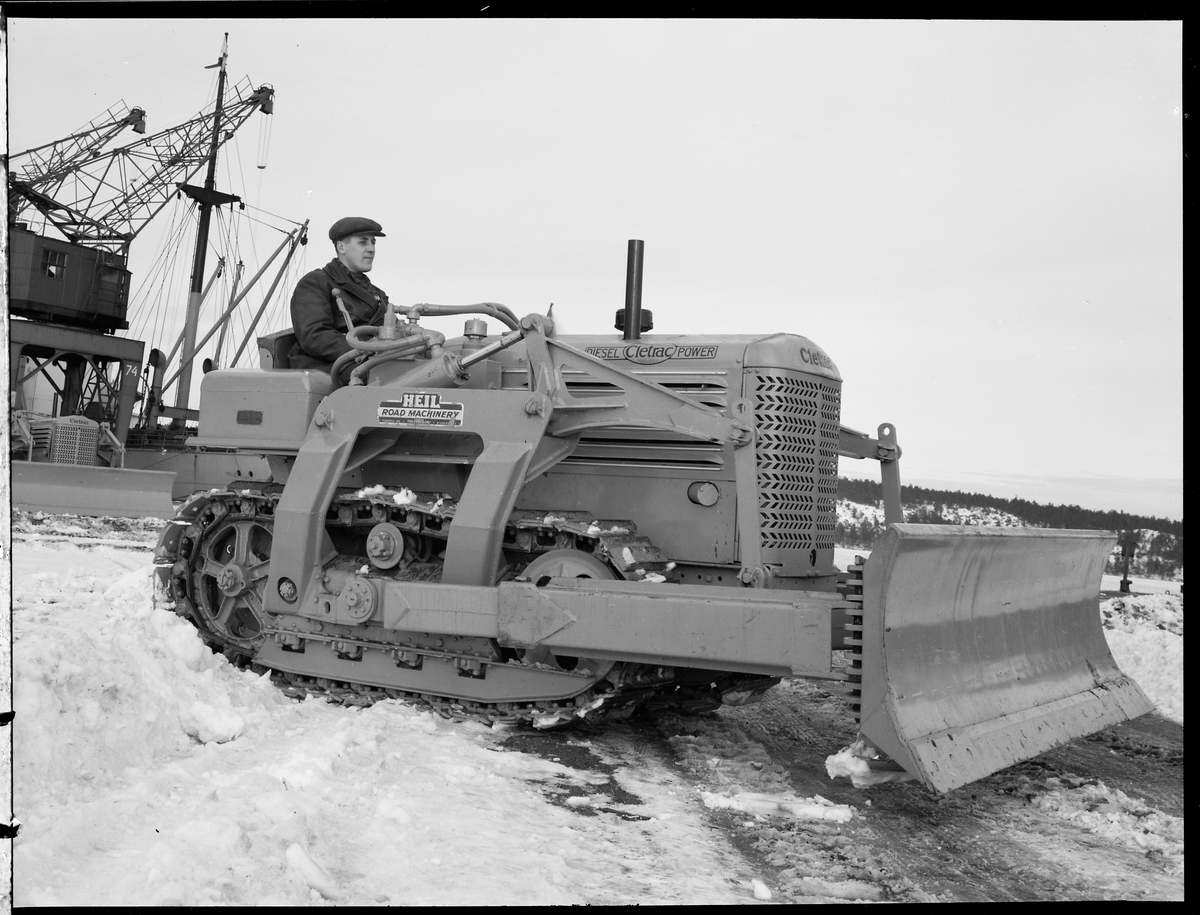 Cletrac bulldozer (schaktmaskin) vid hamnområde.