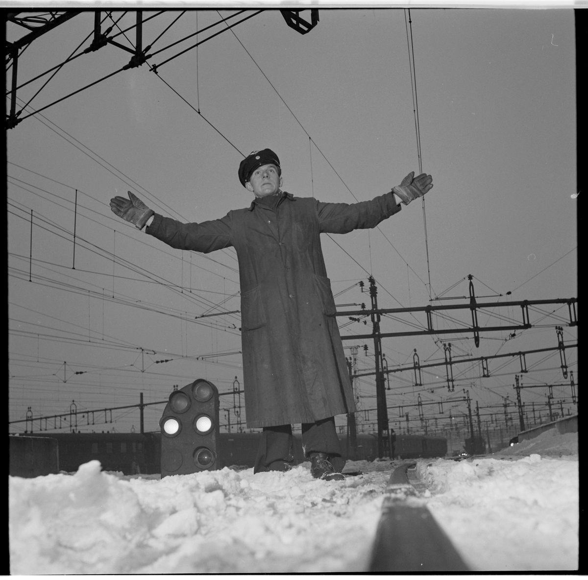 Personal signalerar på bangård.