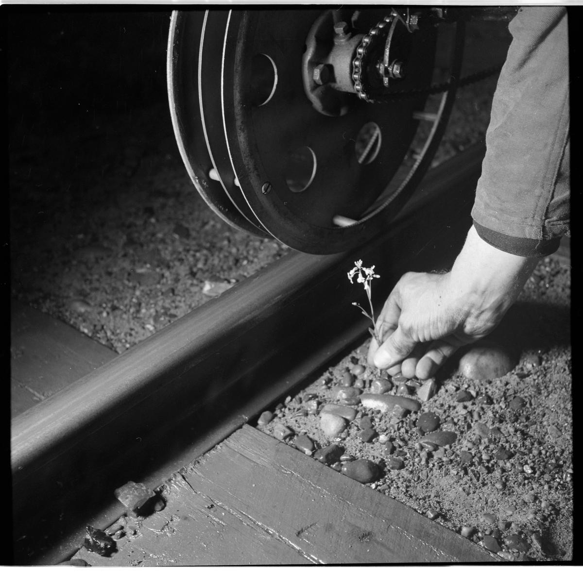 Personalen plockar en blomma vid spår.